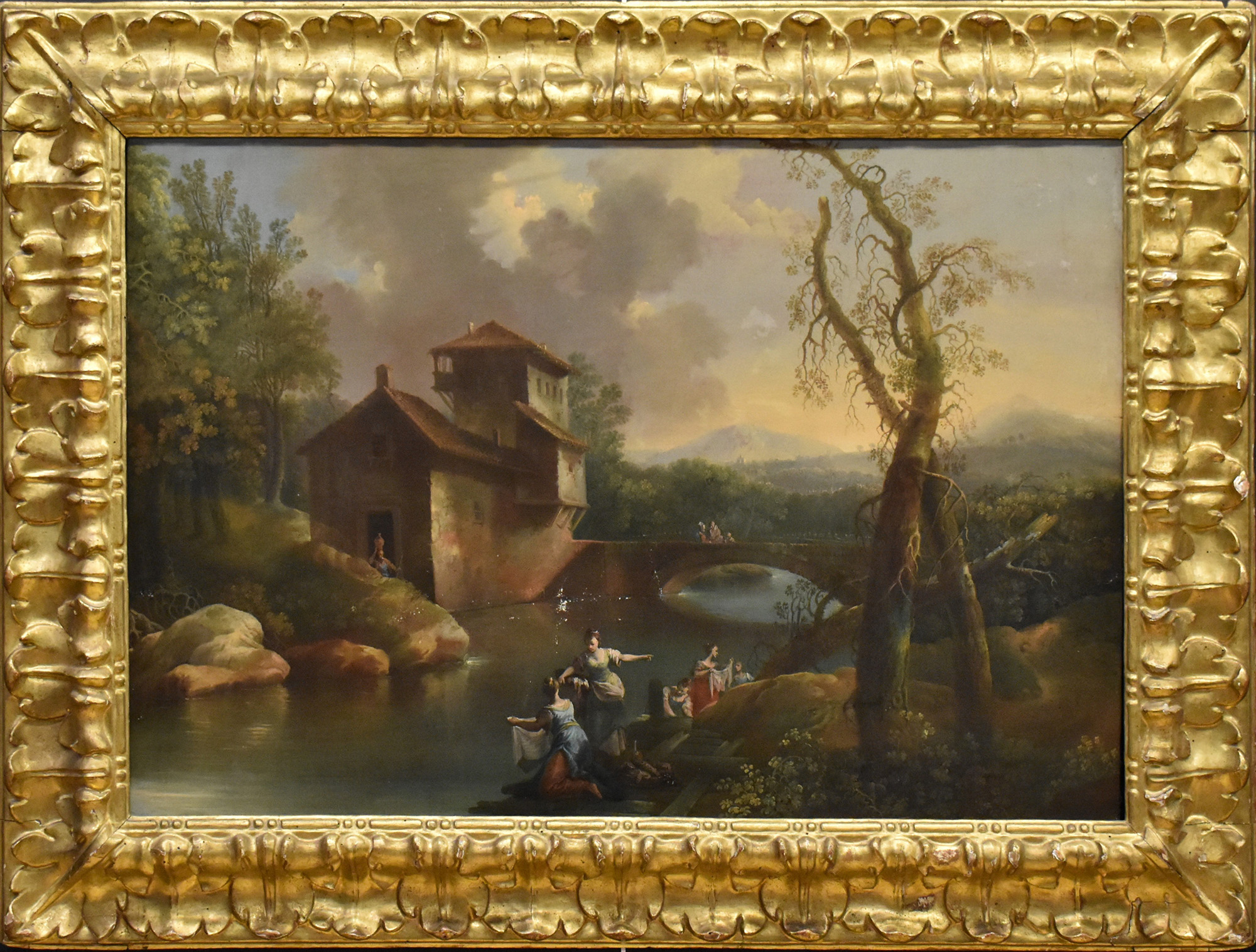 'Paesaggio con fiumi e personaggi' olio su tela Italia sec.XVIII