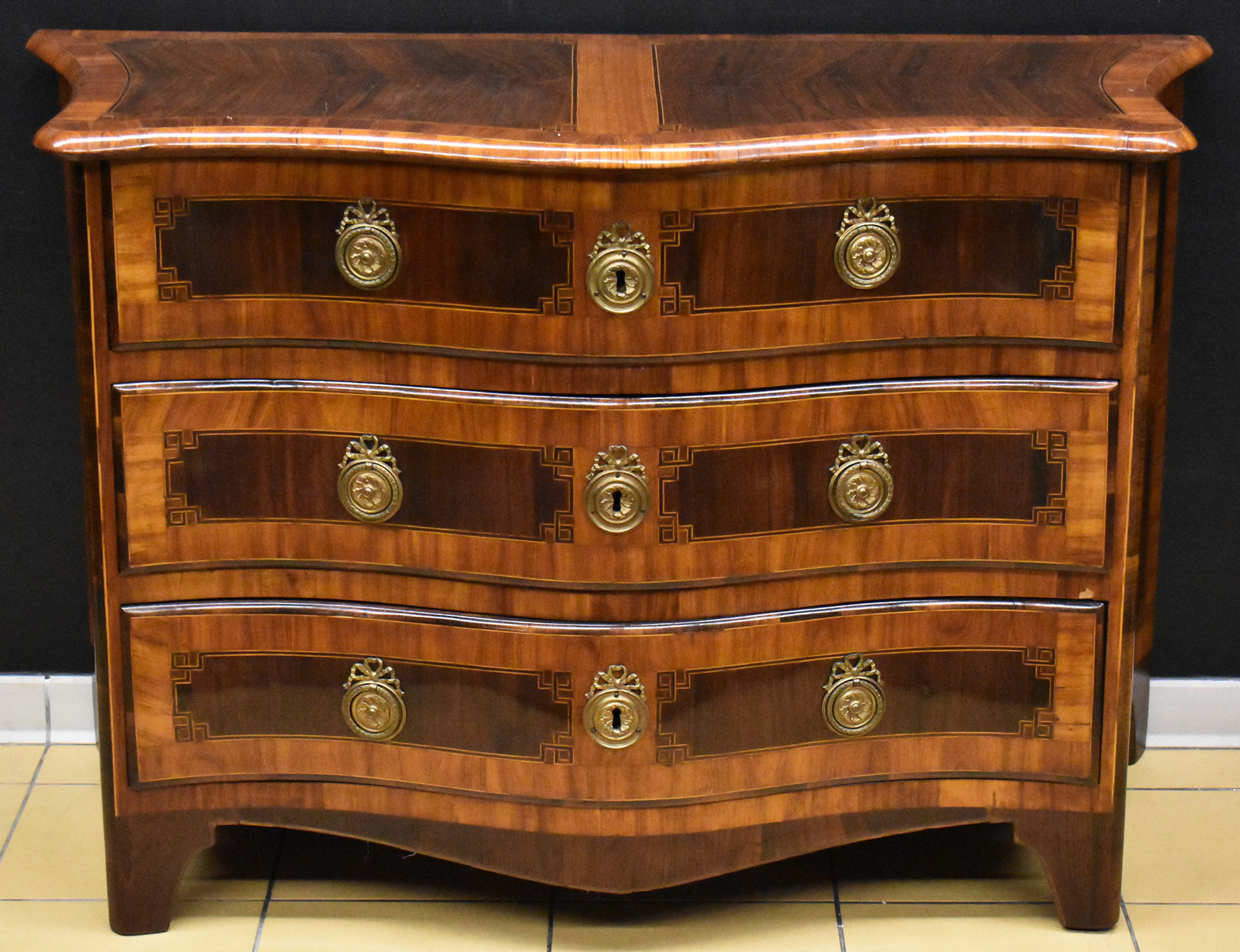 Cassettone mosso sul fronte e sui fianchi lastronato in legni vari Piemonte sec.XVIII