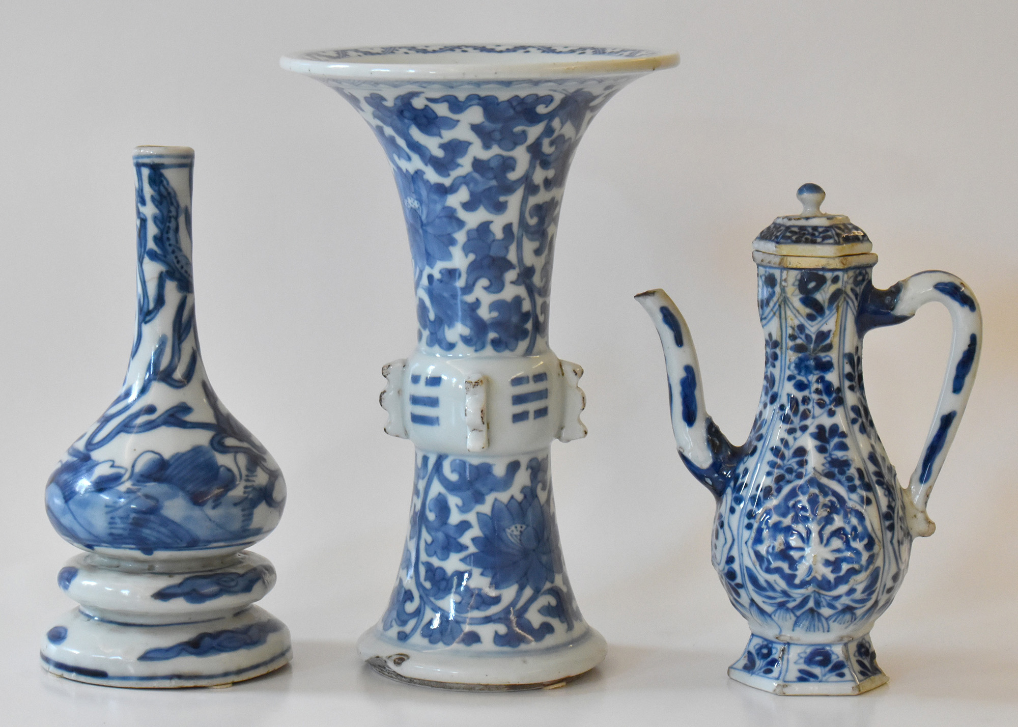 Cina n.3 oggetti in porcellana bianca e blu h 21 5/19 5/18 5 cm