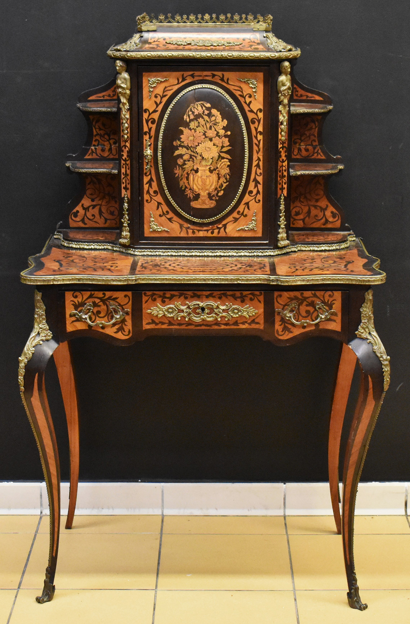 Scrivania con alzatina intarsiata in legni vari Francia epoca Napoleone III sec.XIX
