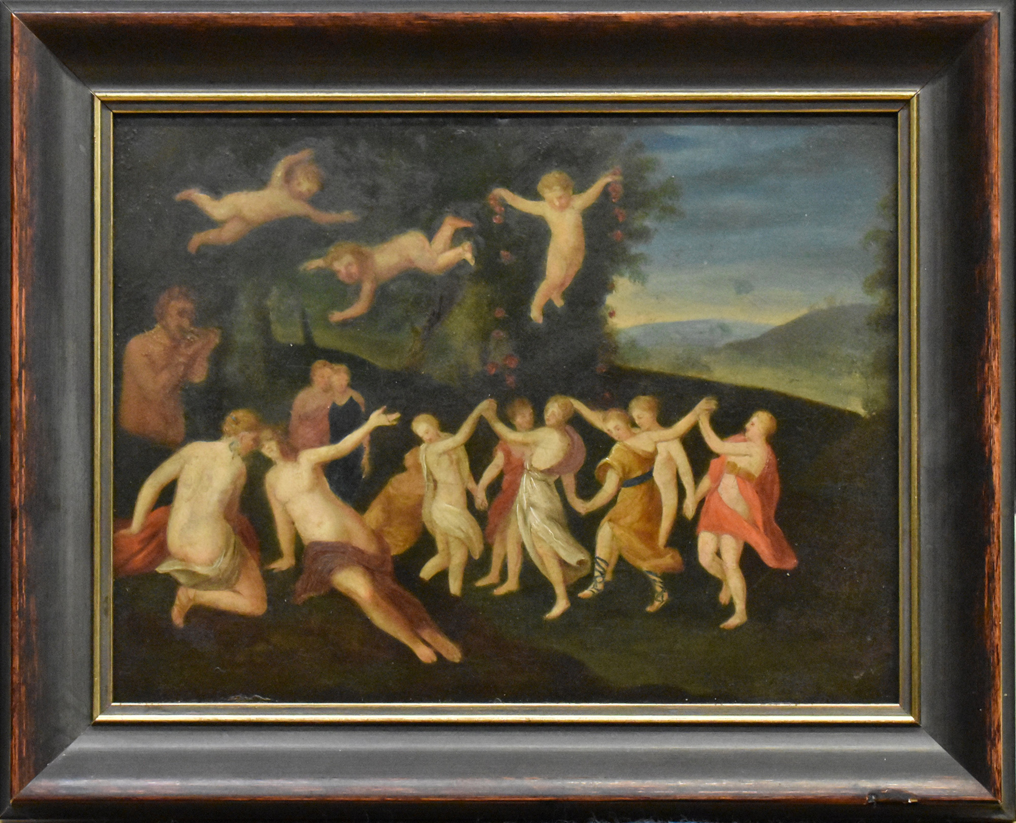 'Paesaggio con ninfe e satiri' olio su rame scuola fiamminga sec.XVII