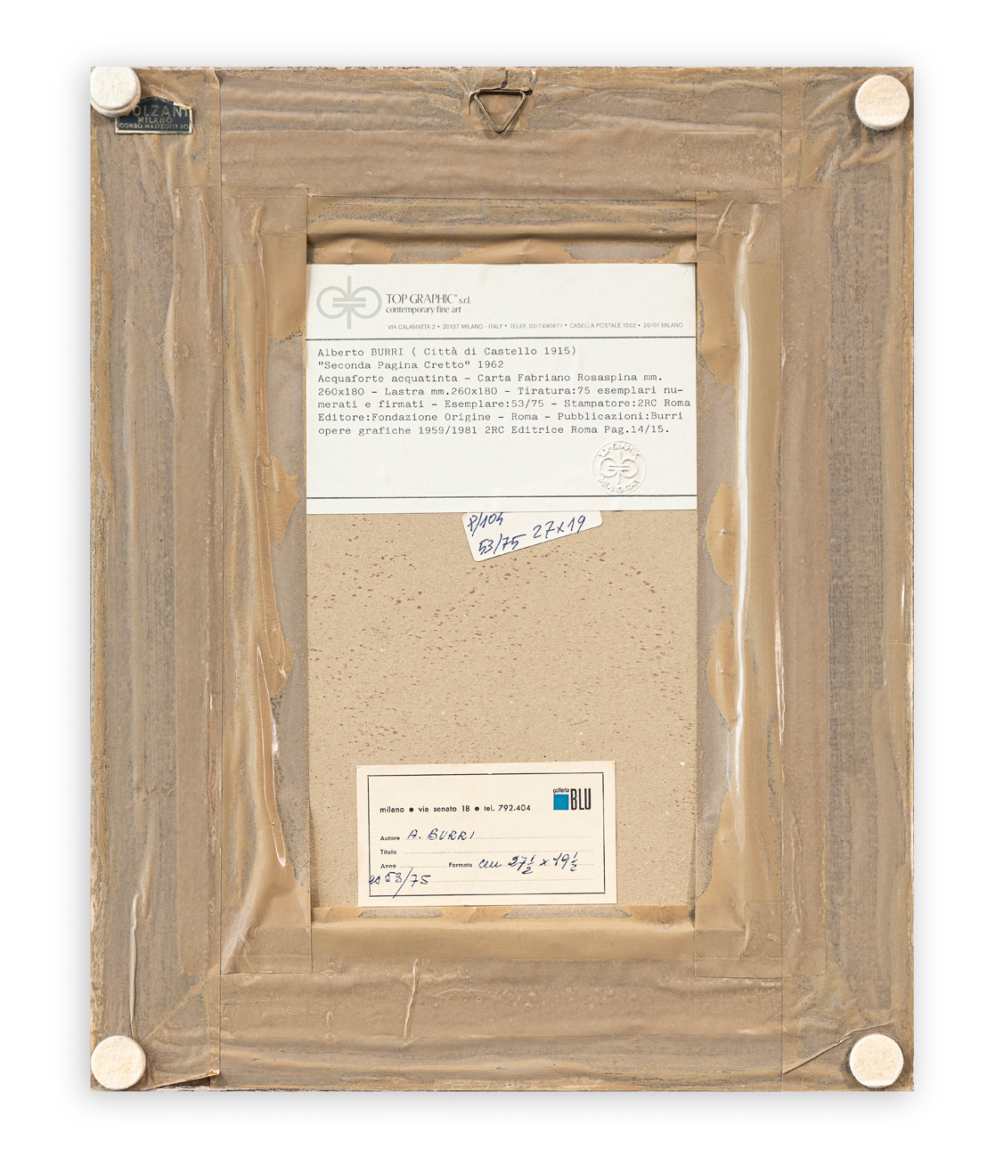 Etichetta della Top Graphic Contemporary Fine Art (MI) al retro della tavola protettiva