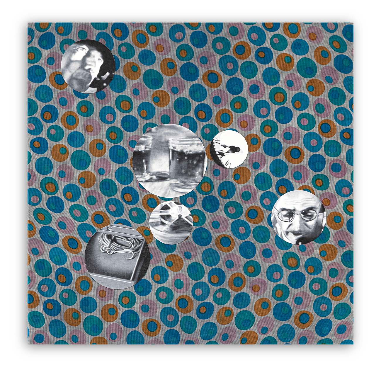 Collage di ritagli circolari di tela, dipinti ad olio, su tessuto