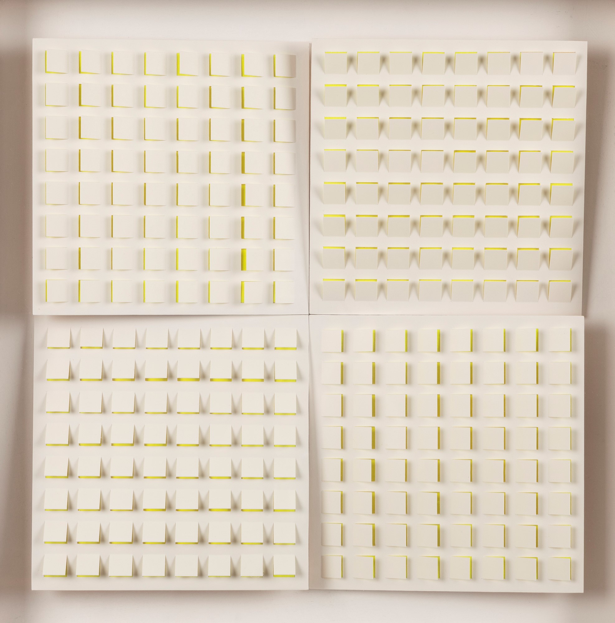 Titolato, datato e firmato al verso: Superfici a interferenza luminosa 41x8 a,b,c,d su giallo" 1971 Claudio Rotta Loria