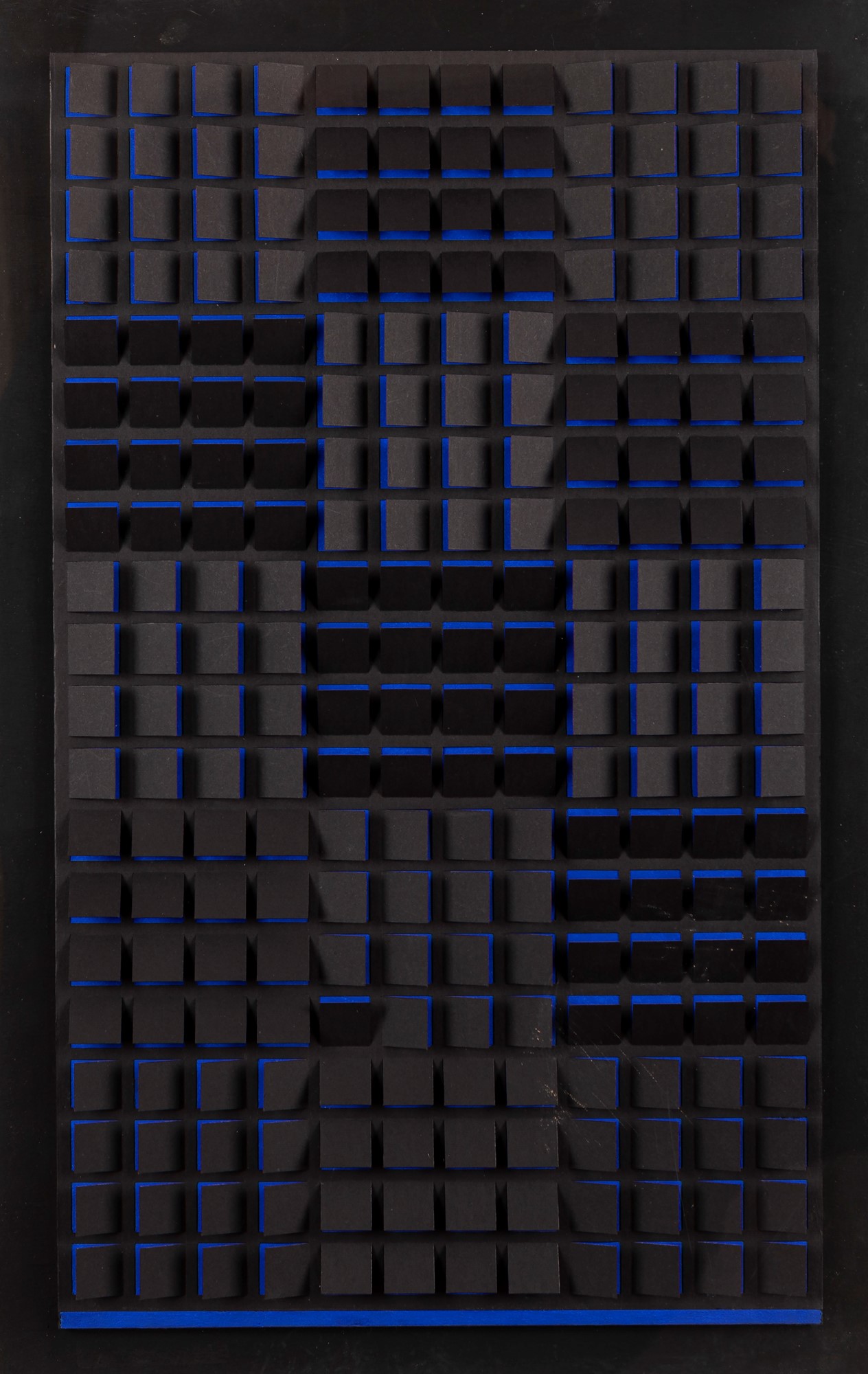 Titolato, datato e firmato al verso: "Superfice a interferenza luminosa 1Nx12 su 20 adcb su blu" 1973 Claudio Rotta Loria