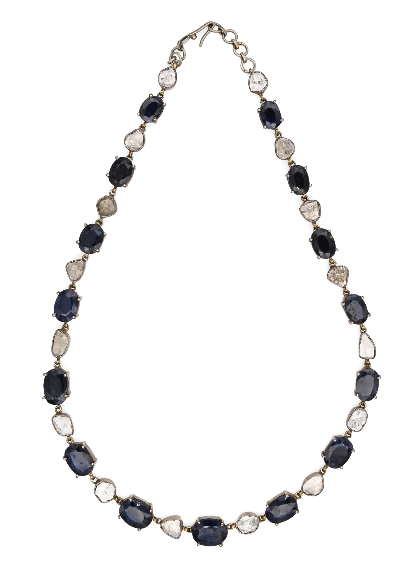 Collana antica in argento, metallo, zaffiri e diamanti Argento 800/000, metallo, diamanti in taglio rosa incastonati a notte, ct. 3 ca, zaffiri australiani, ct. 45 ca. Lunghezza cm 43