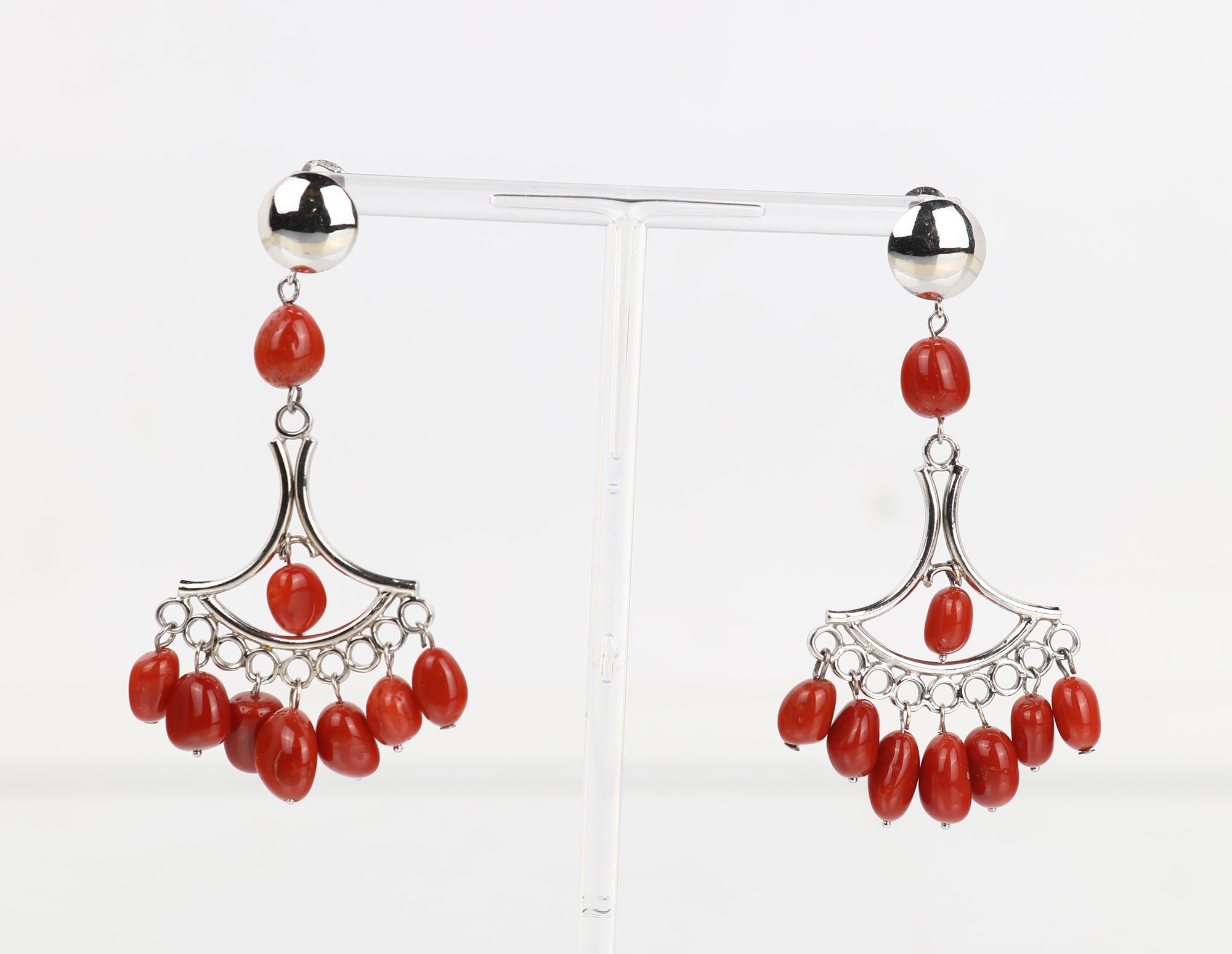 Coppia di orecchini in oro e corallo Oro bianco 750/000. Peso complessivo gr 30. Lunghezza cm 8