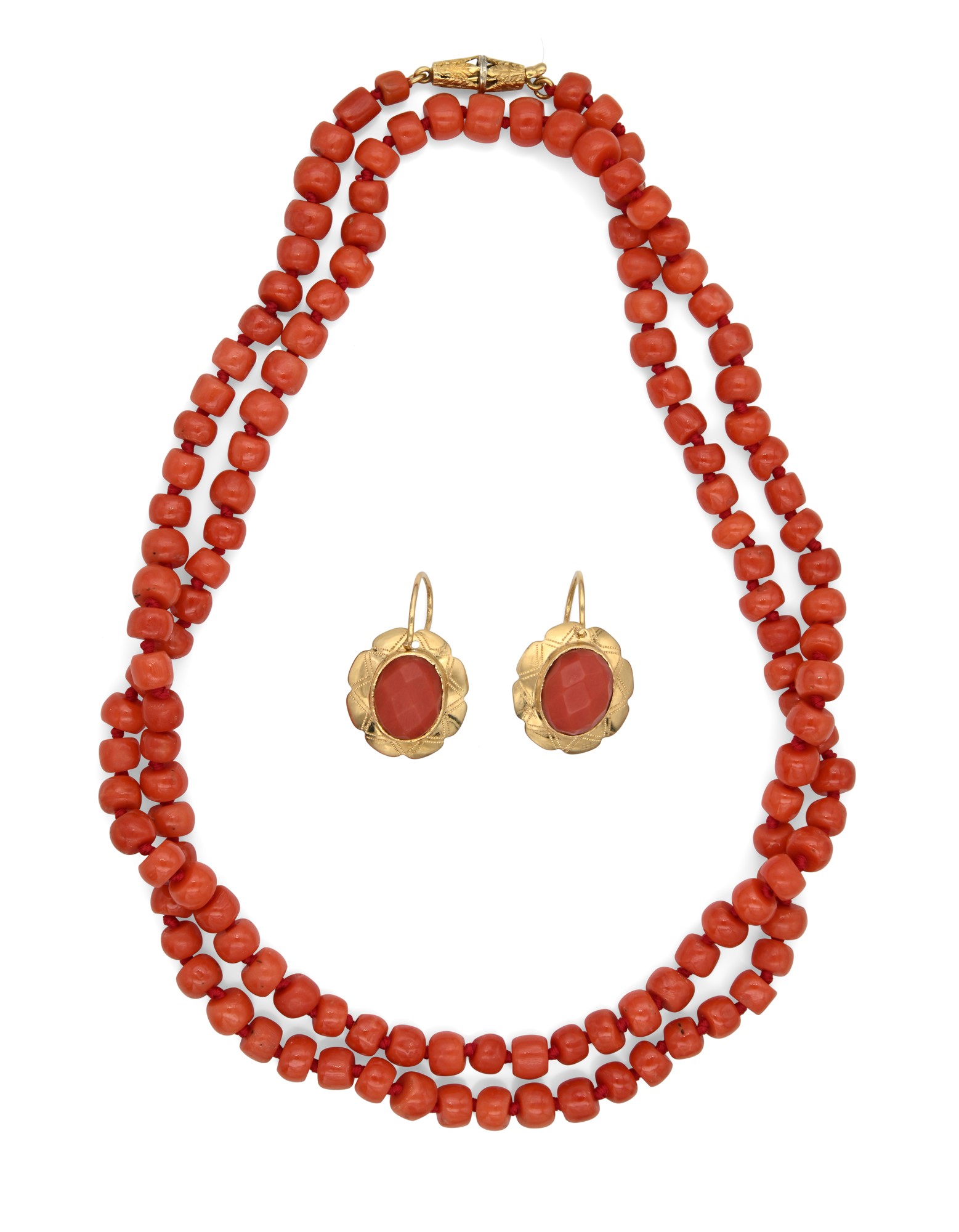 Parure di collana e orecchini in oro e corallo Oro giallo 750/000. Corallo in taglio barilotto liscio e faccettato. Peso complessivo gr. 52,90 Collana lunghezza cm 80, orecchini cm 2,5