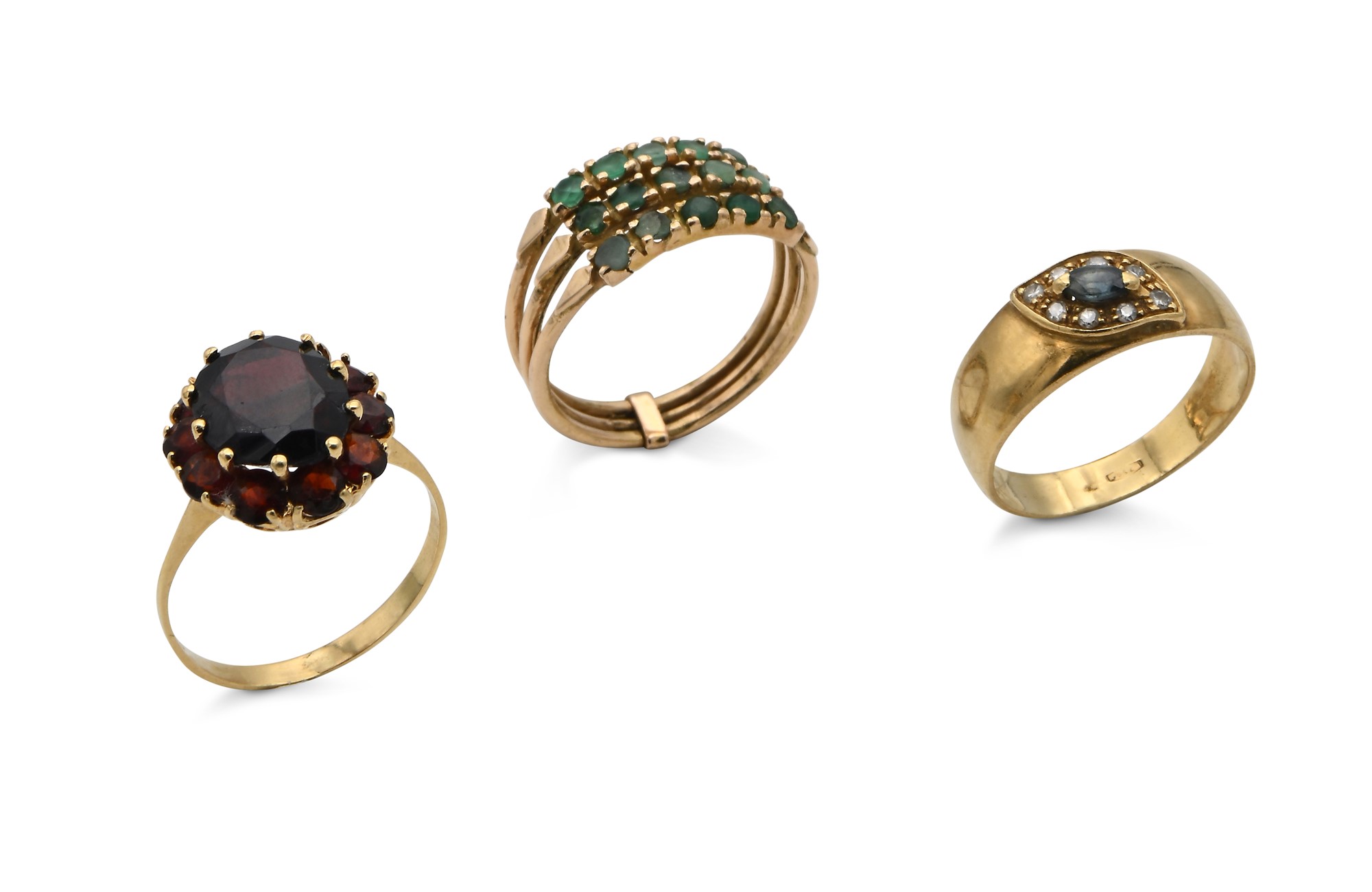 Gruppo di 3 anelli in oro, smeraldi, zaffiro e granati Oro giallo 750/000. Peso complessivo gr. 11,50 Misure12/14