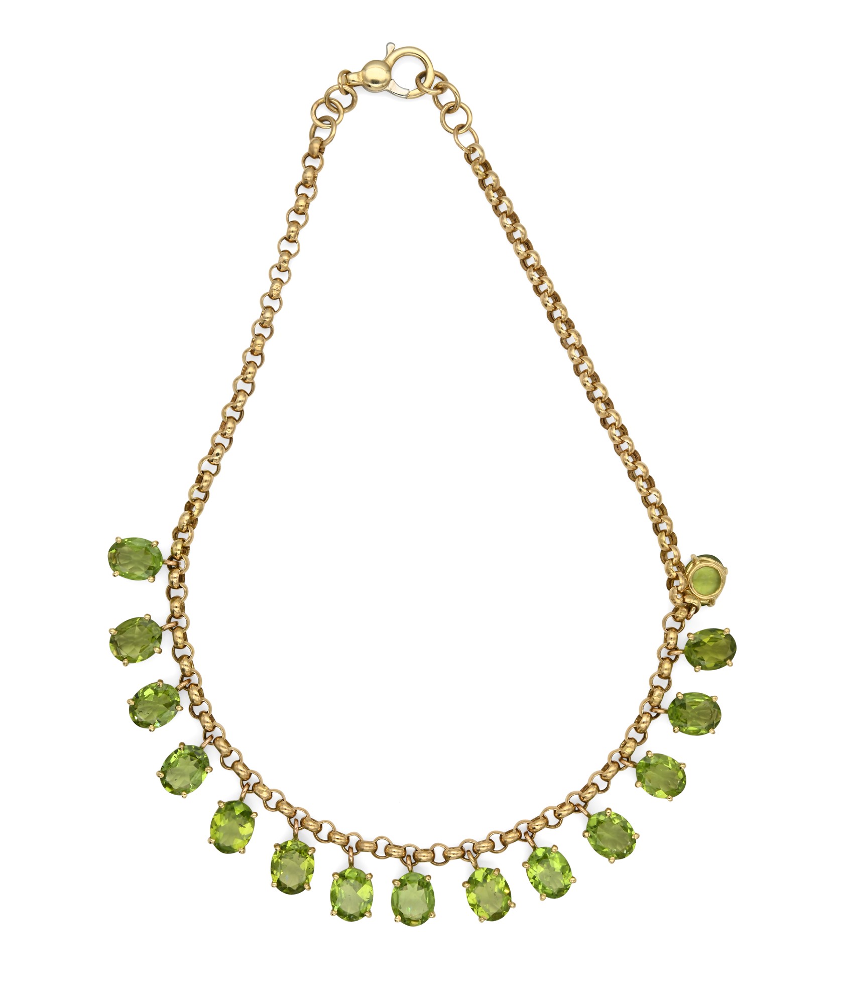 Girocollo in oro e peridoti Oro giallo 750/000. Peridoti in taglio ovale ct. 45 ca. Peso complessivo gr. 32,30 Lunghezza cm 38