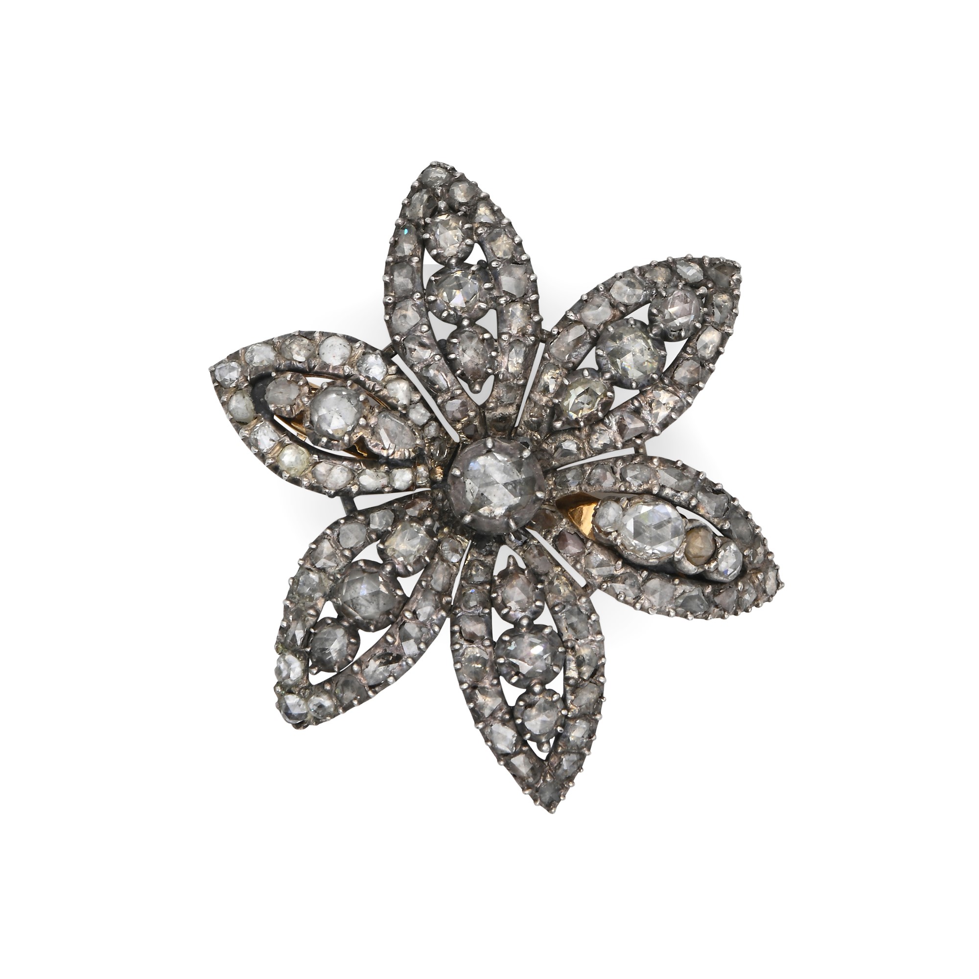 Spilla antica a fiore in oro, argento e diamanti Oro 585/000, argento. Diamanti in taglio rosa ct. 4,50 ca, con incastonatura a notte. Peso complessivo gr. 22,90 Fine XVIII/Primi XIX