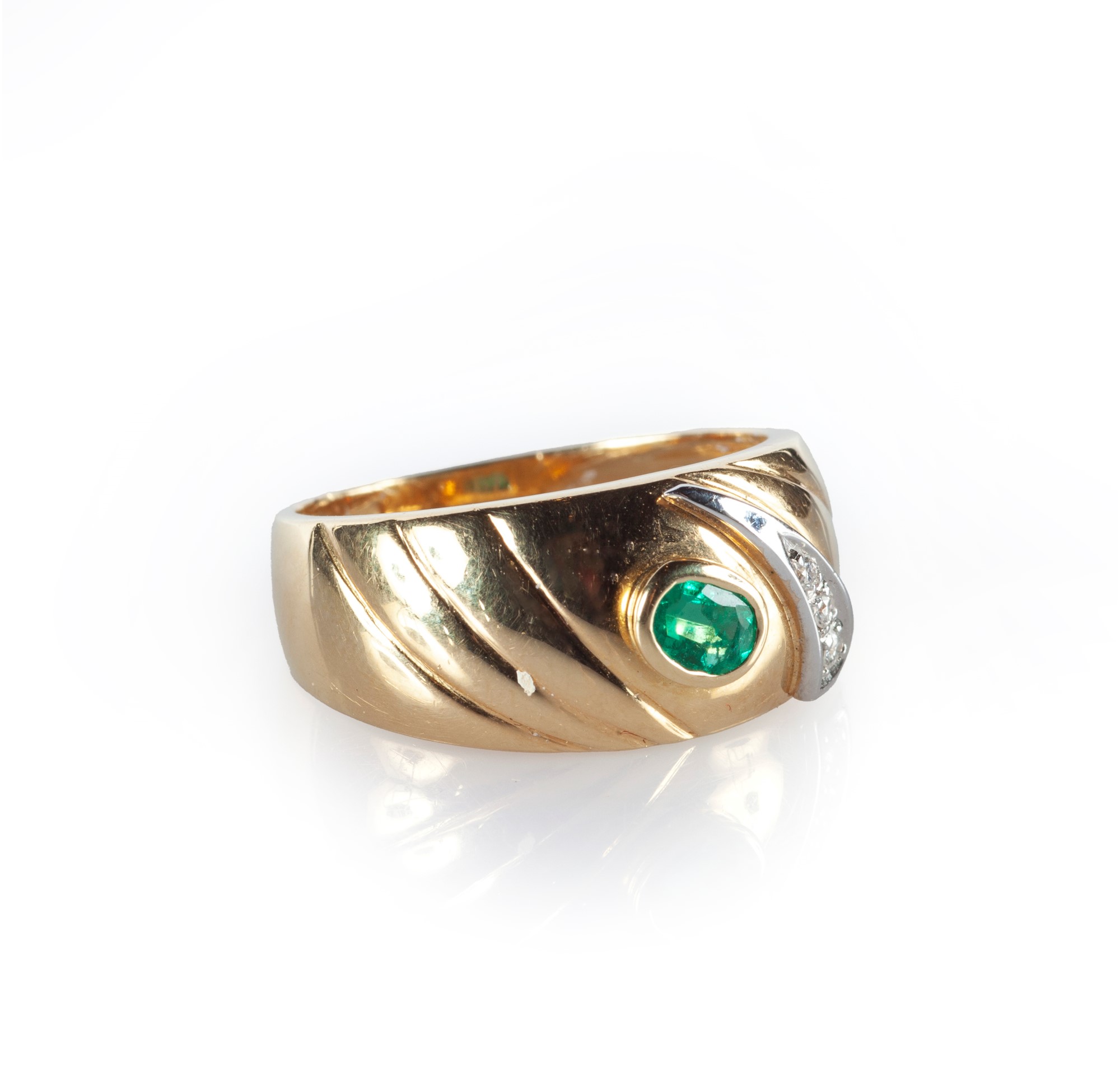 Damiani, anello a fascia in oro, smeraldo e brillanti Oro bianco 750/000. Peso complessivo gr. 5 Misura 14