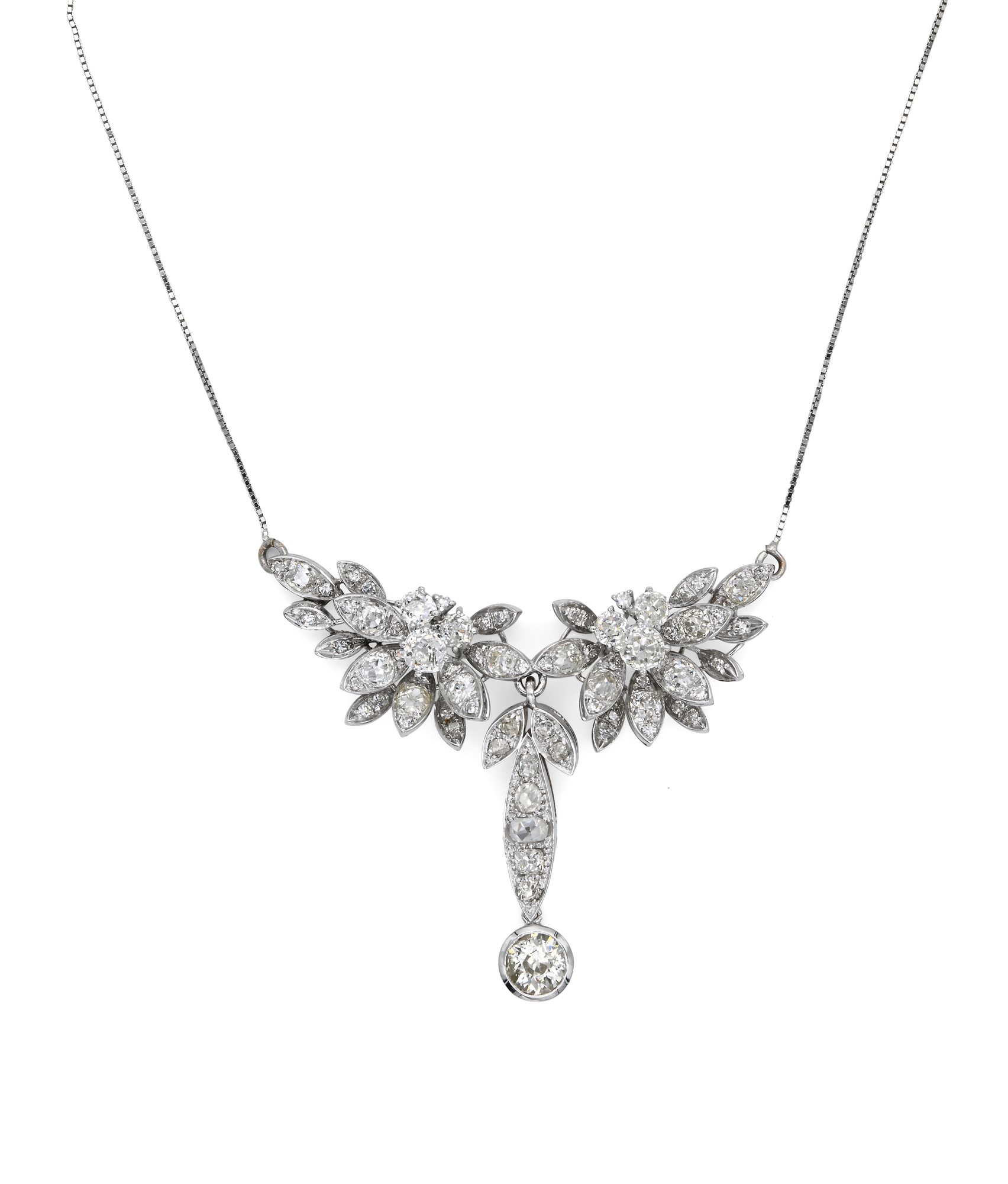 Pendente in oro e diamanti Oro bianco 750/000. Diamanti in taglio rotondo antico ct. 3,20 ca. Peso complessivo gr. 14,10 Lunghezza cm 45