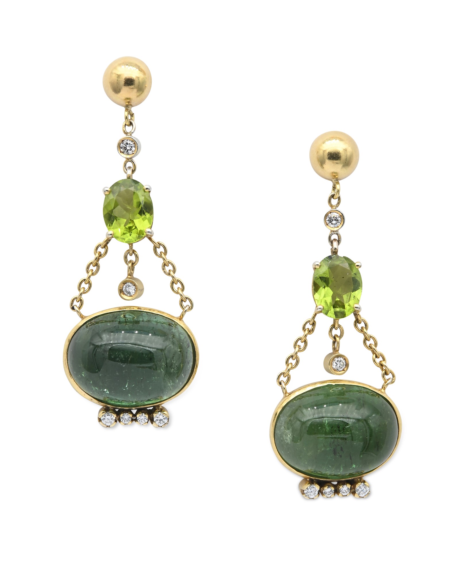 Coppia di orecchini pendenti in oro, tormaline verdi, peridoti e brillanti...