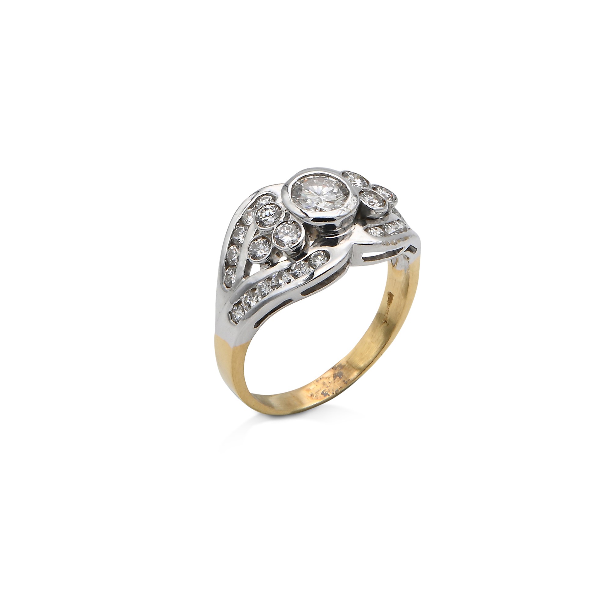 Anello in oro e brillanti Oro giallo e bianco 750/000. Diamante centrale in taglio rotondo brillante ct. 0,30 ca, brillanti ct. 0,50. Peso complessivo gr. 5,80 Misura 15