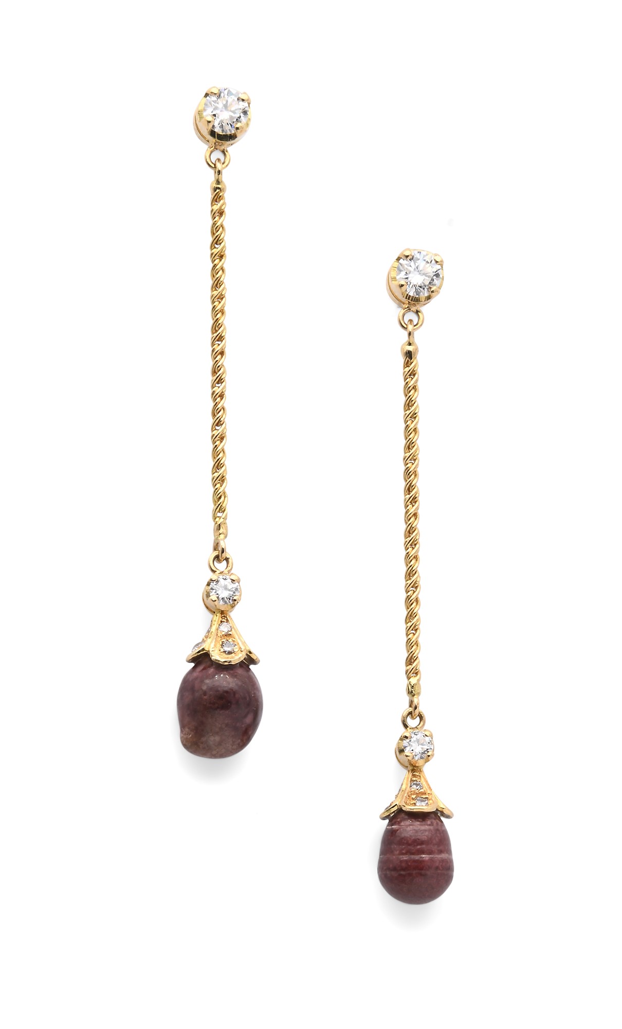 Coppia di orecchini in oro, diamanti e perle Scallop Oro giallo 750/000. Perle naturali spontanee Scallop ct. 4,92. Diamanti in taglio rotondo brillante ct. 0,38 F-G, VVS. Peso complessivo gr. 5. Corredati di certificazioni gemmologiche GIA n° 16140127/16140128 Lunghezza cm 6