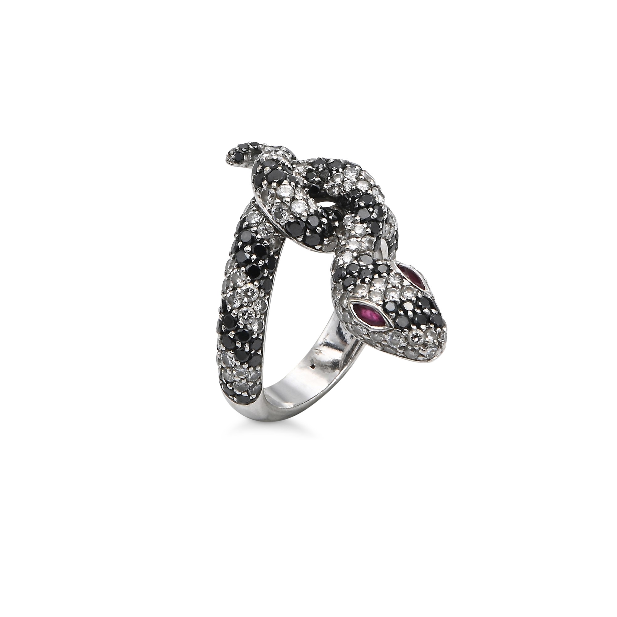 Anello a serpente in oro, brillanti e rubini Oro bianco 750/000. Diamanti in taglio rotondo brillante ct. 2,30 ca. Peso complessivo gr. 10,30. Misura 16