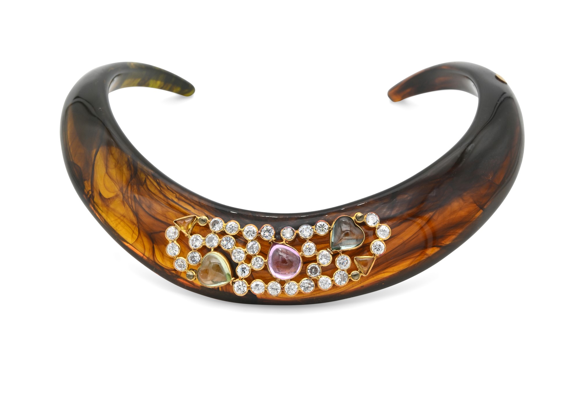 Trea, collier in bachelite, oro, quarzi Oro giallo 750/000. Veste cm 40