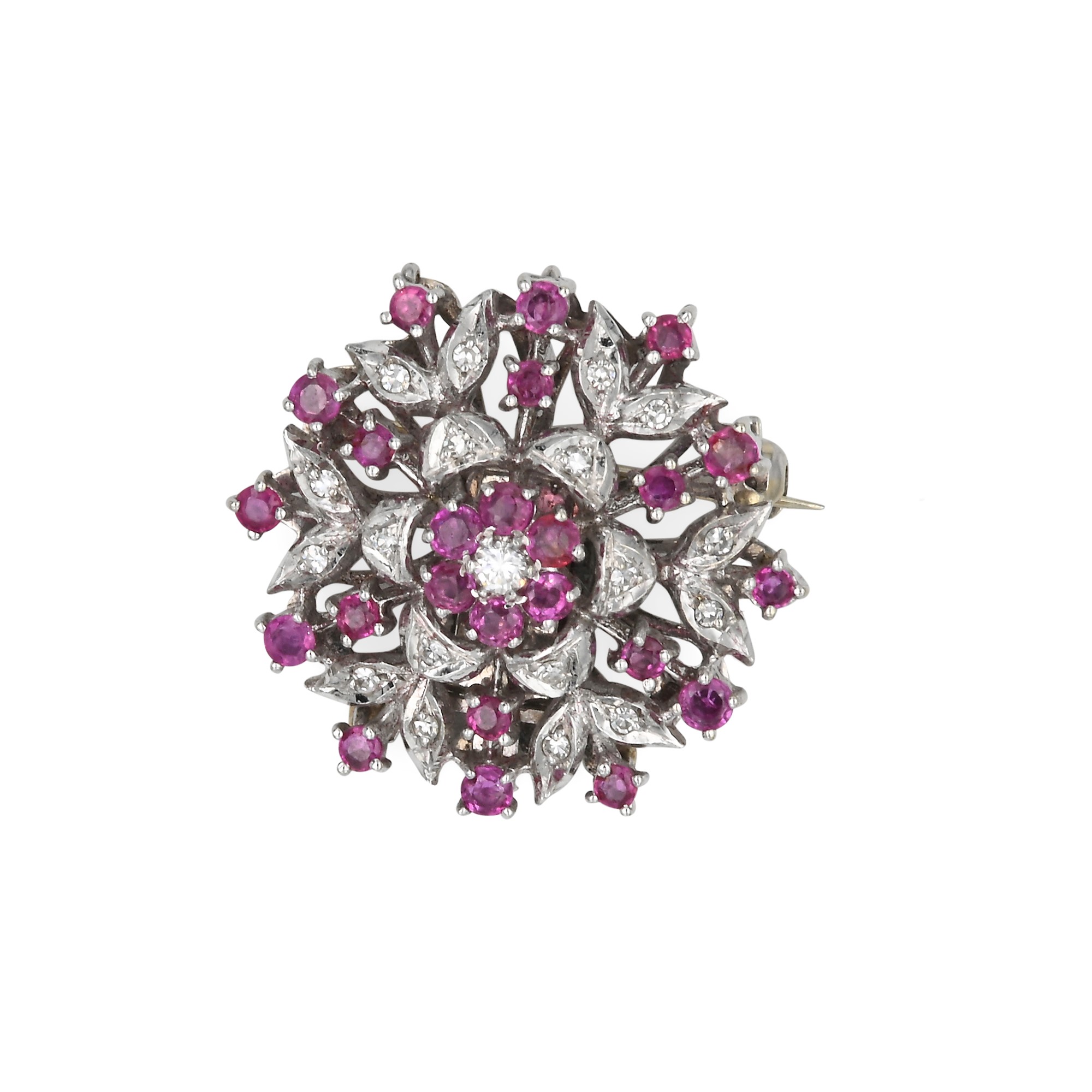 Spilla in oro, brillanti e rubini Oro bianco 750/000. Peso complessivo gr. 10,70 Diametro cm 3