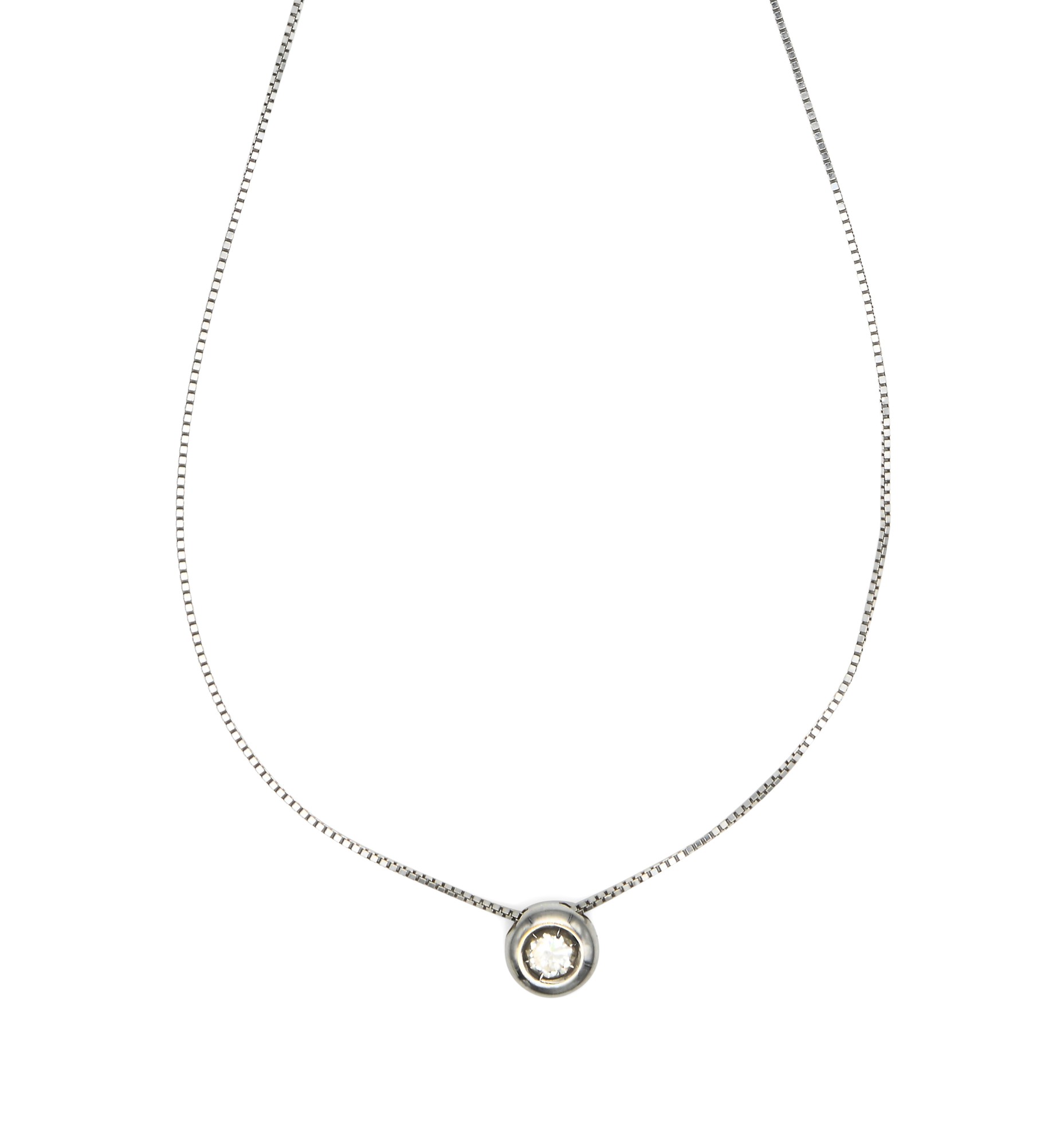 Pendente punto luce in oro e brillante Oro bianco 750/000. Diamante in taglio rotondo brillante ct 0,20 ca. Peso complessivo gr 2,4 Lunghezza cm 42