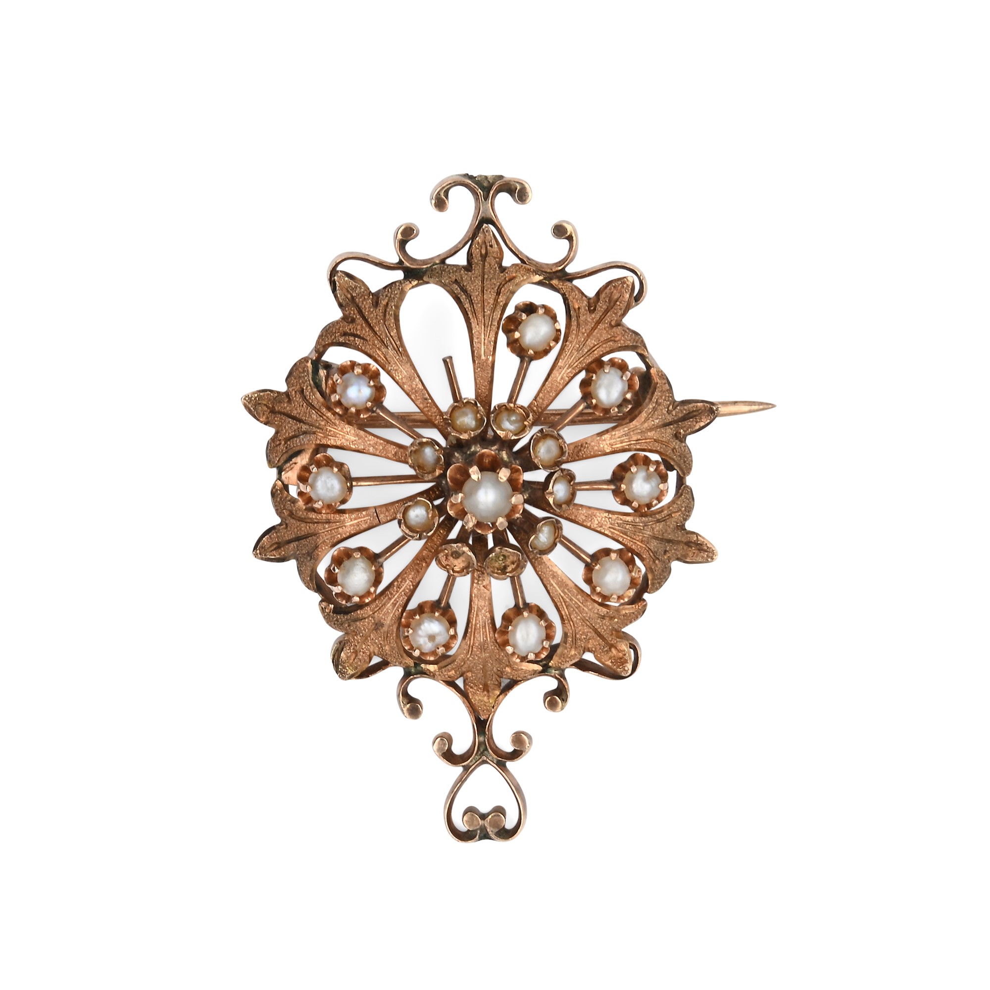 Spilla antica in oro e microperle Oro giallo 585/000. Peso complessivo gr. 10,80. Diametro cm 3
