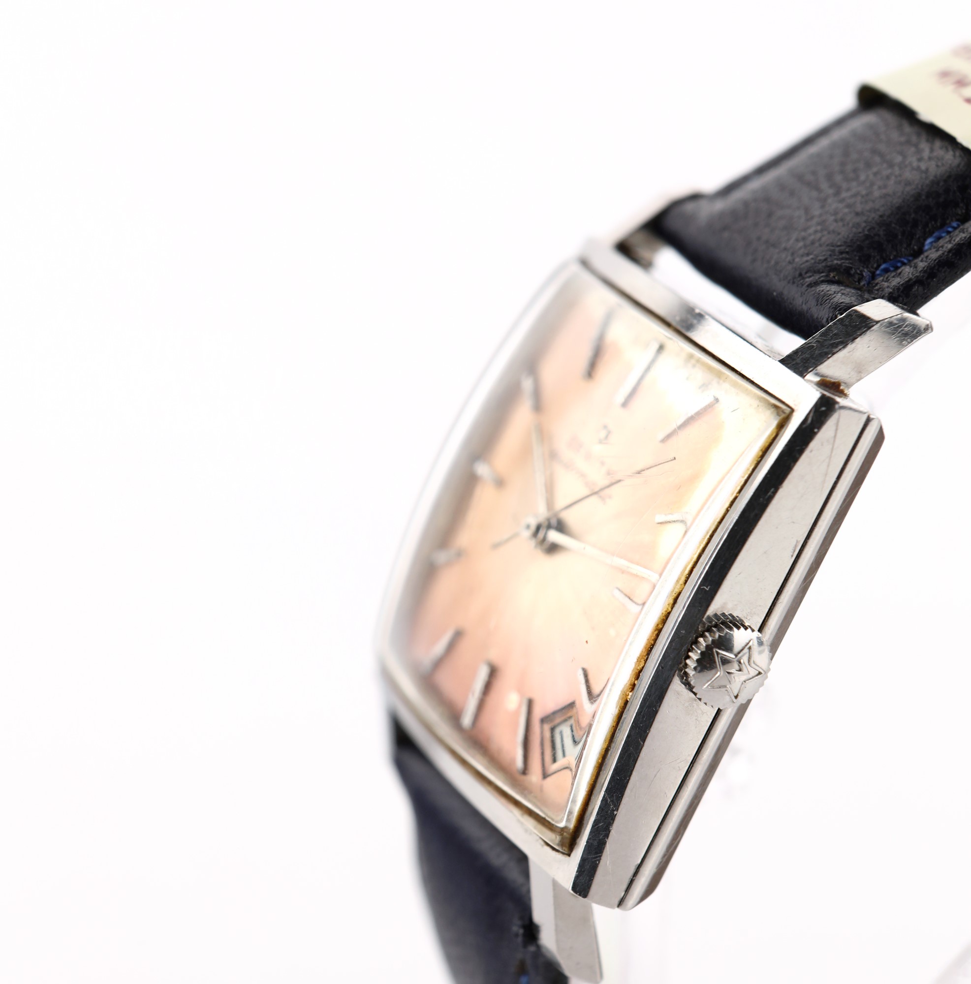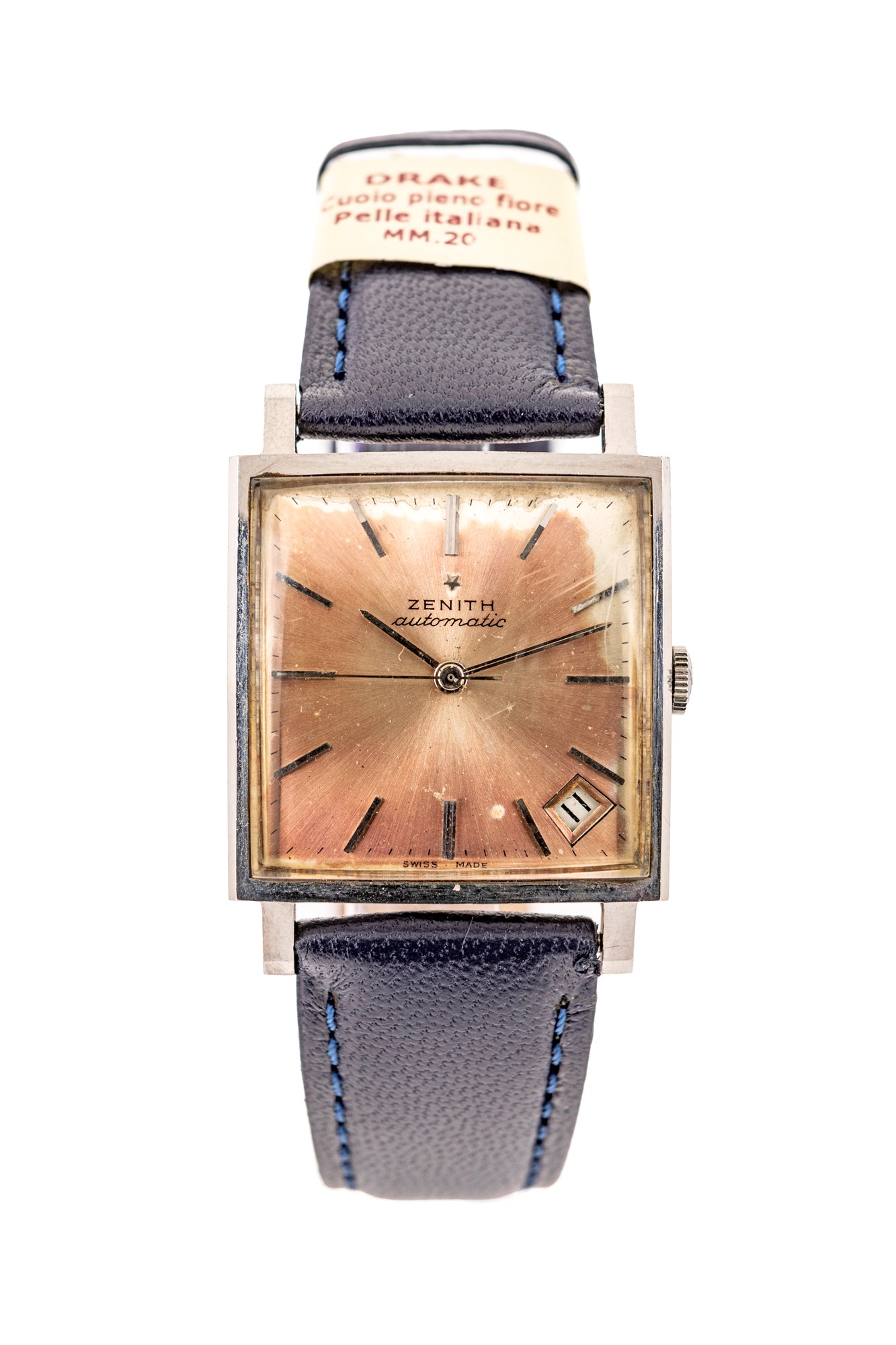 Zenith da polso "respiretor" in acciaio Acciaio. Cassa n° 020A322, fondello a scatto. Quadrante argentato, indici applicati, data, secondi al centro. Movimento automatico, cal 2532, n° 5689053, bilanciere monometalico, spirale piana. Anni '70 Cassa mm. 30 x 30