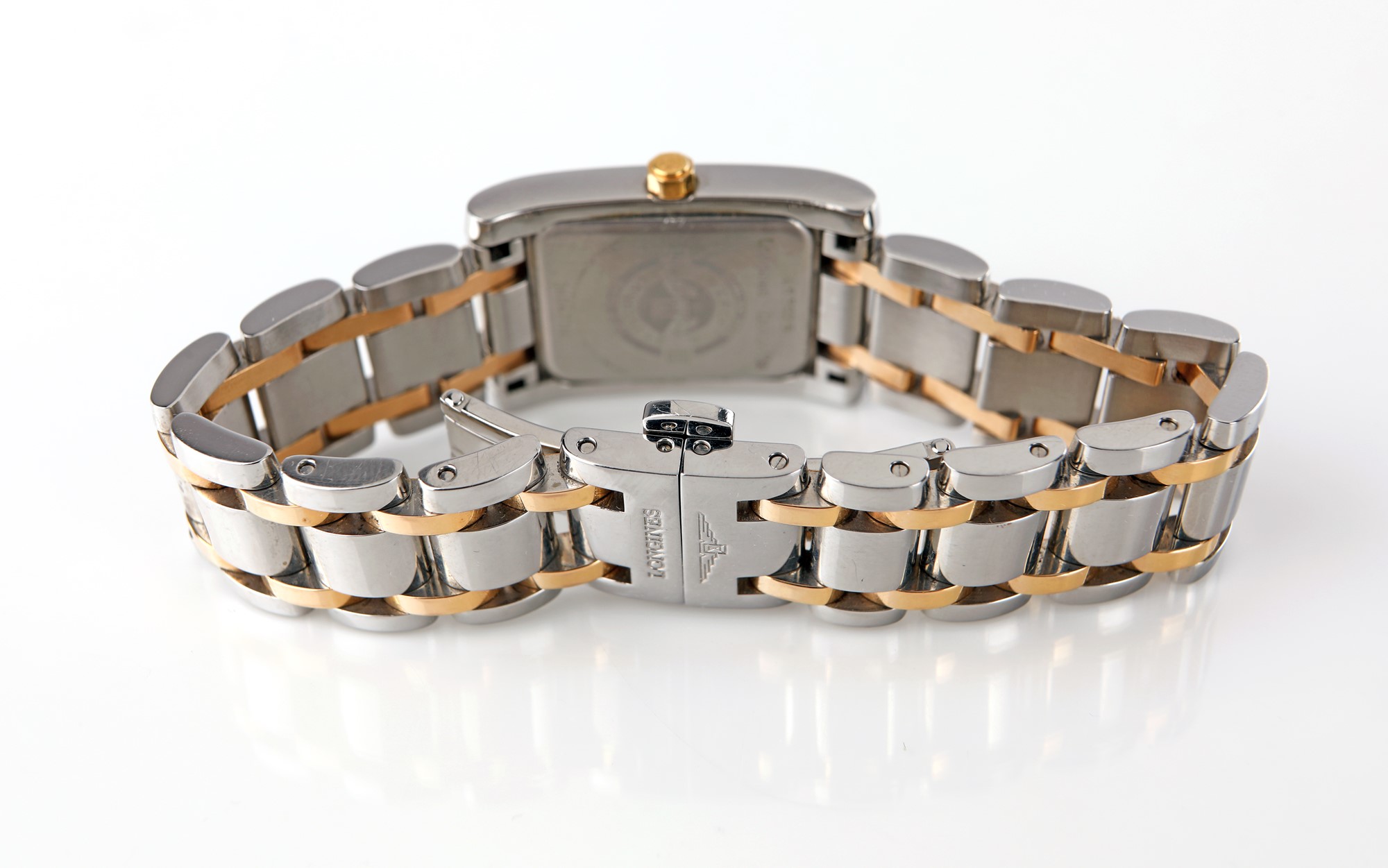 Longines Dolcevita, orologio da polso da donna in acciaio ed oro Acciaio e oro giallo. Ref. L.5.502.5. Cassa n° 36047116, fondello a scatto, bracciale in acciaio e oro, chiusura a deployante. Quadrante in madreperla, indici con diamanti, lancette a spada, secondi in basso. Movimento a quarzo. Anni 2000 mm 22x mm. 26