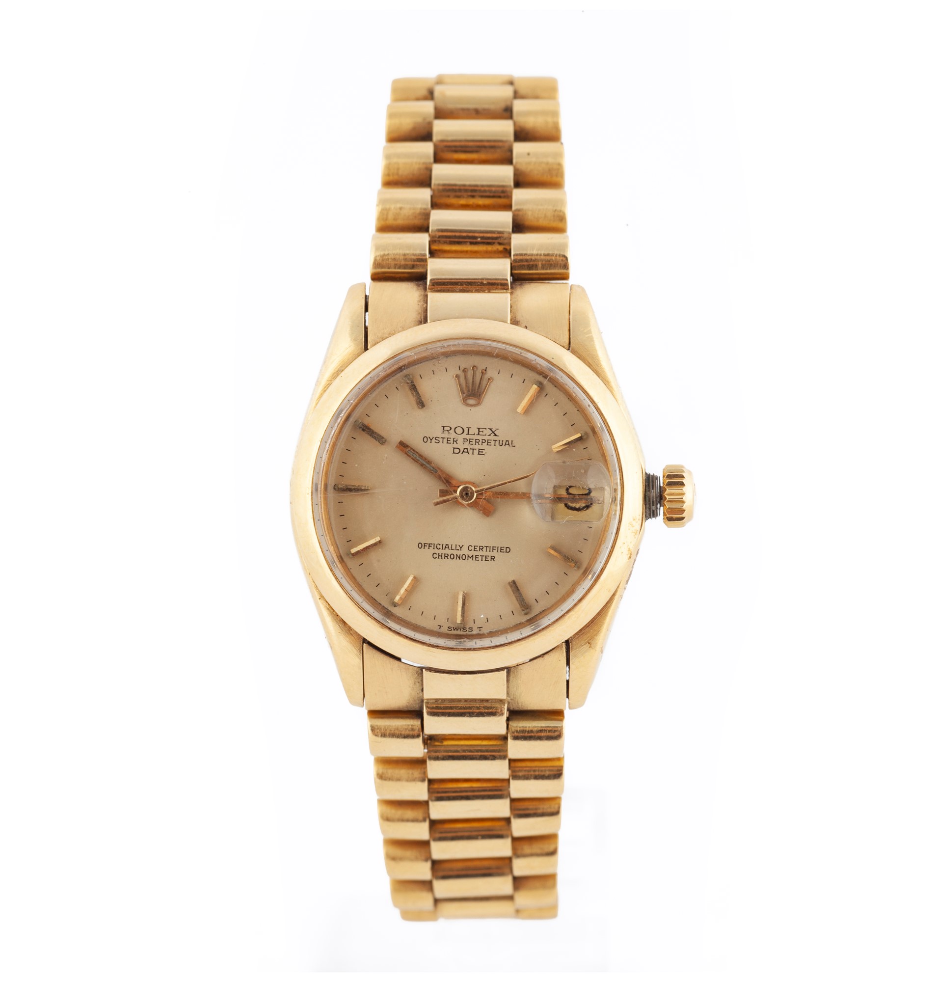 Oro giallo 750/000. Ref. 6624, corona a vite, fondello a vite ref. 6627. Bracciale Rolex President in oro 750/000, chiusura a scomparsa. Quadrante champagne, indici applicati, datta, lancette a bastone, secondi al centro. Movimento automatico, cal 1131, n° 42715, bilanciere monometalico, spirale piana. Godronatura sul fondello leggermente usurata. Peso complessivo gr. 86,10