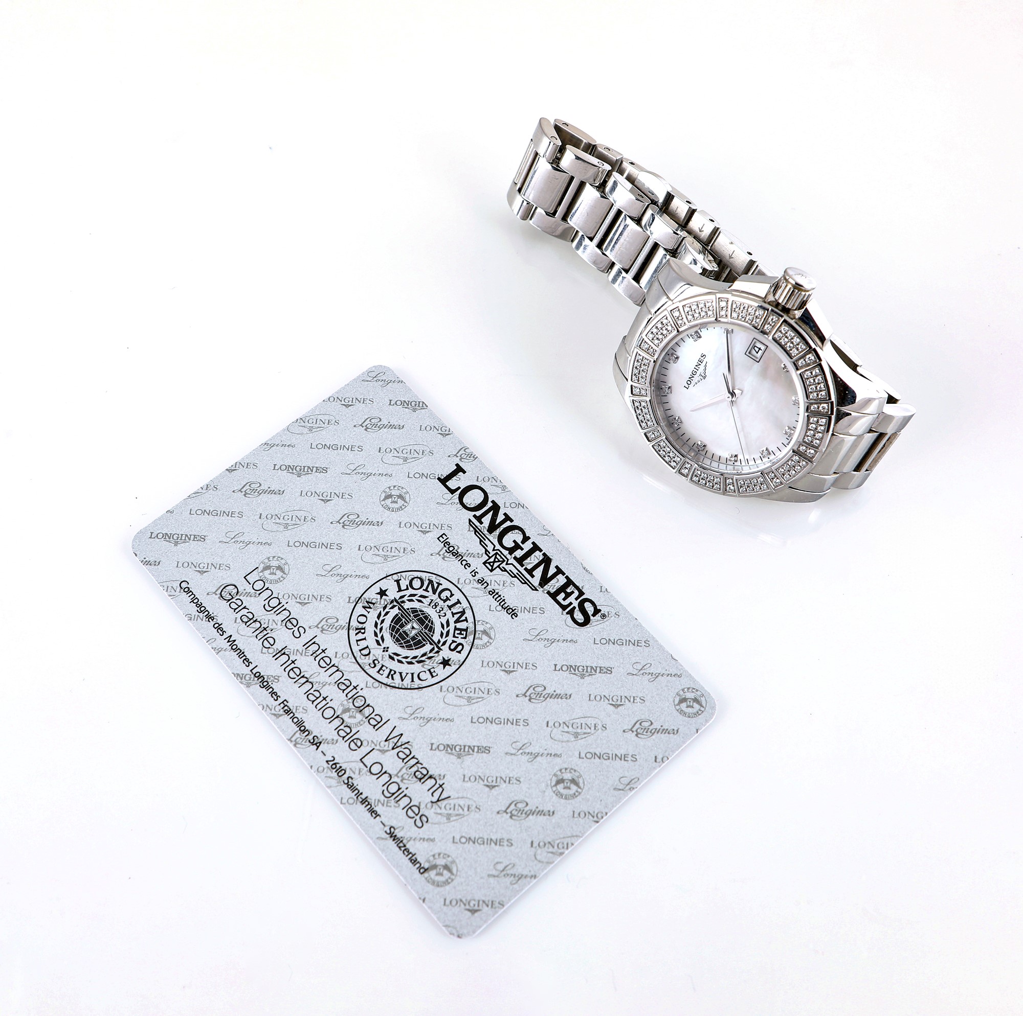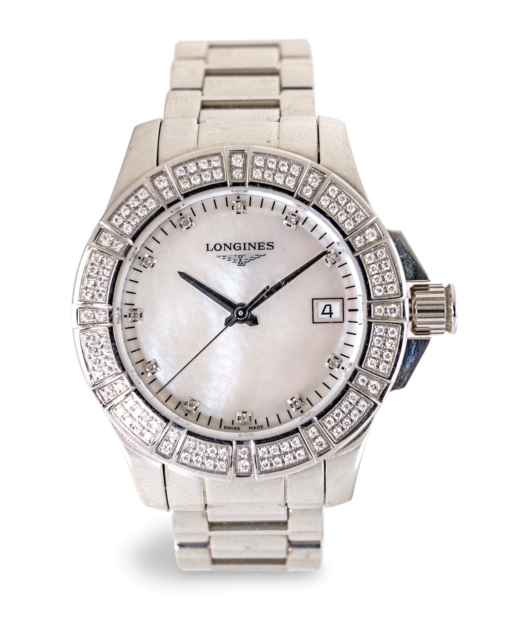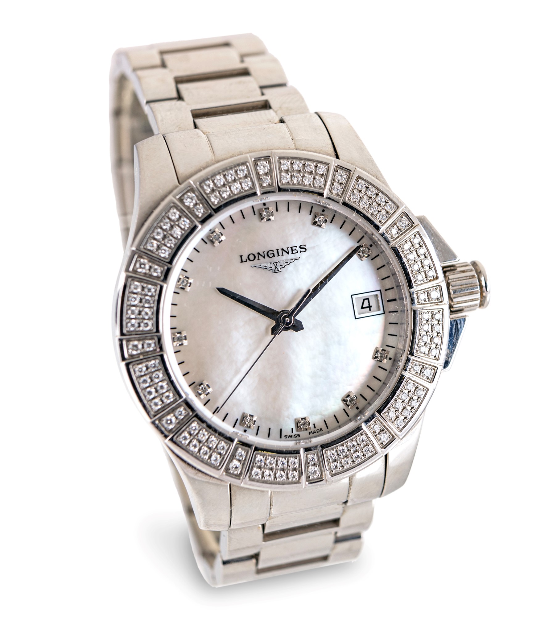 Longines Conquest, orologio da polso in acciaio e diamanti Acciaio e diamanti. Ref.L 32800876 Cassa n°39747998. Fondello a vite, bracciale in acciaio, chiusura a scomparsa. Quadrante in madreperla, indici con diamanti, data, secondi al centro. Movimento a quarzo. Accessori: garanzia. anni 2016 Diametro mm. 35