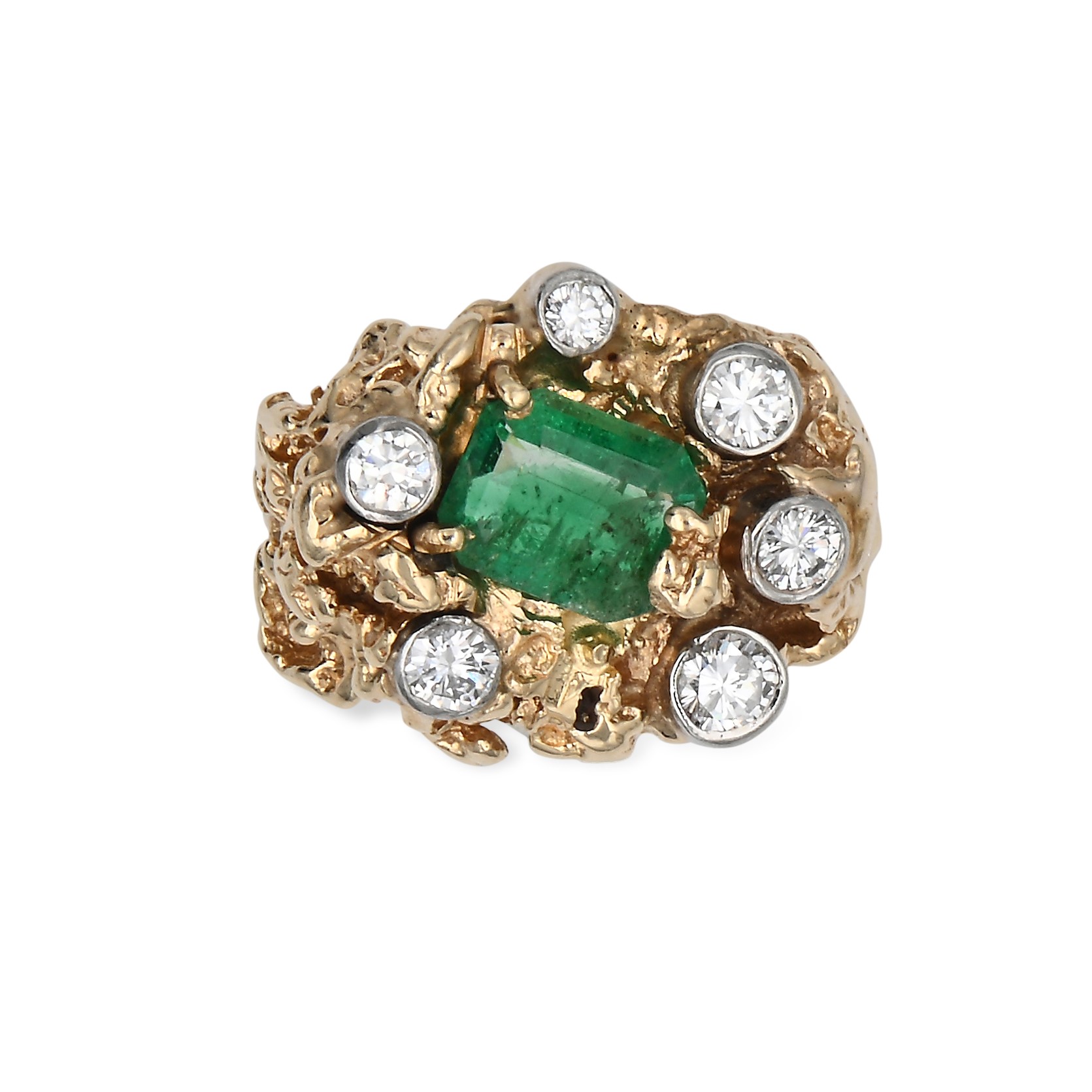 Anello a corteccia in oro, smeraldo e brillanti Oro giallo 750/000. Smeraldo ct. 2 ca. Diamanti in taglio rotondo brillante ct. 0,70 ca. Peso complessivo gr. 13,60. Misura 12