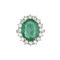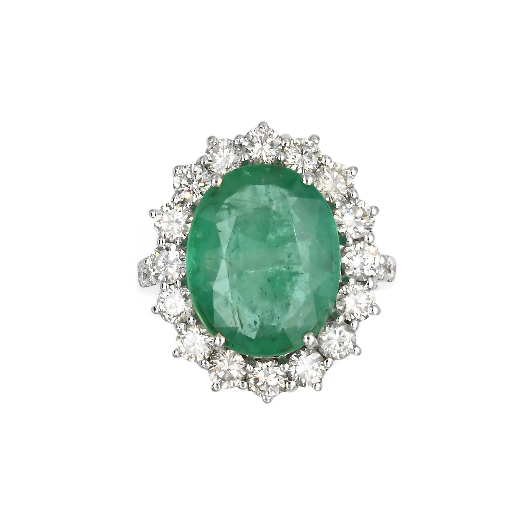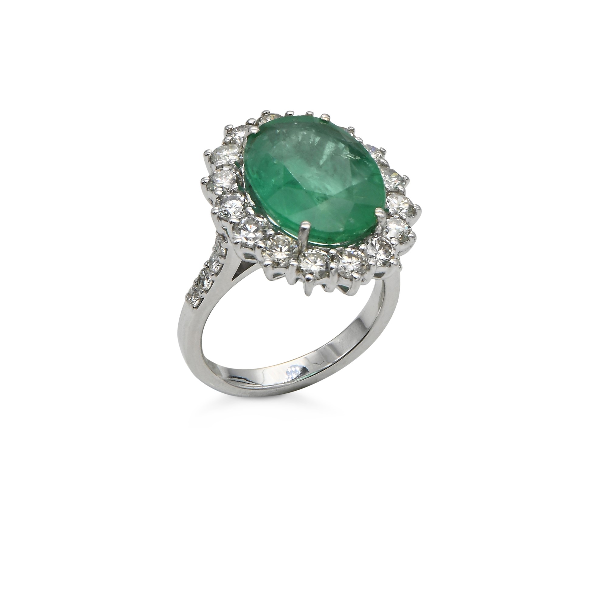 Anello in oro, smeraldo e brillanti Oro bianco 750/000. Smeraldo naturale in taglio ovale ct. 7,25. Diamanti naturali in taglio rotondo brillante ct. 2,33, F,VS. Peso complessivo gr. 10,20. Corredato di certificazione gemmologica. Misura 14
