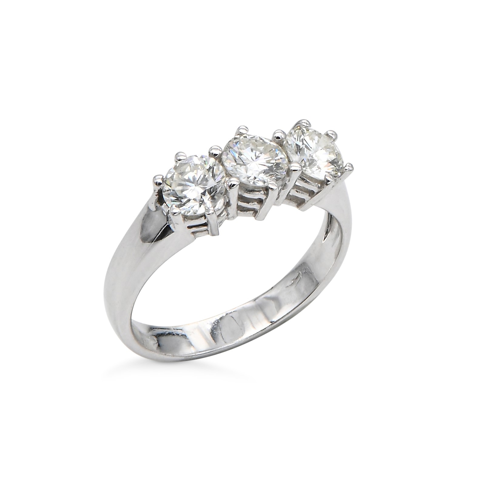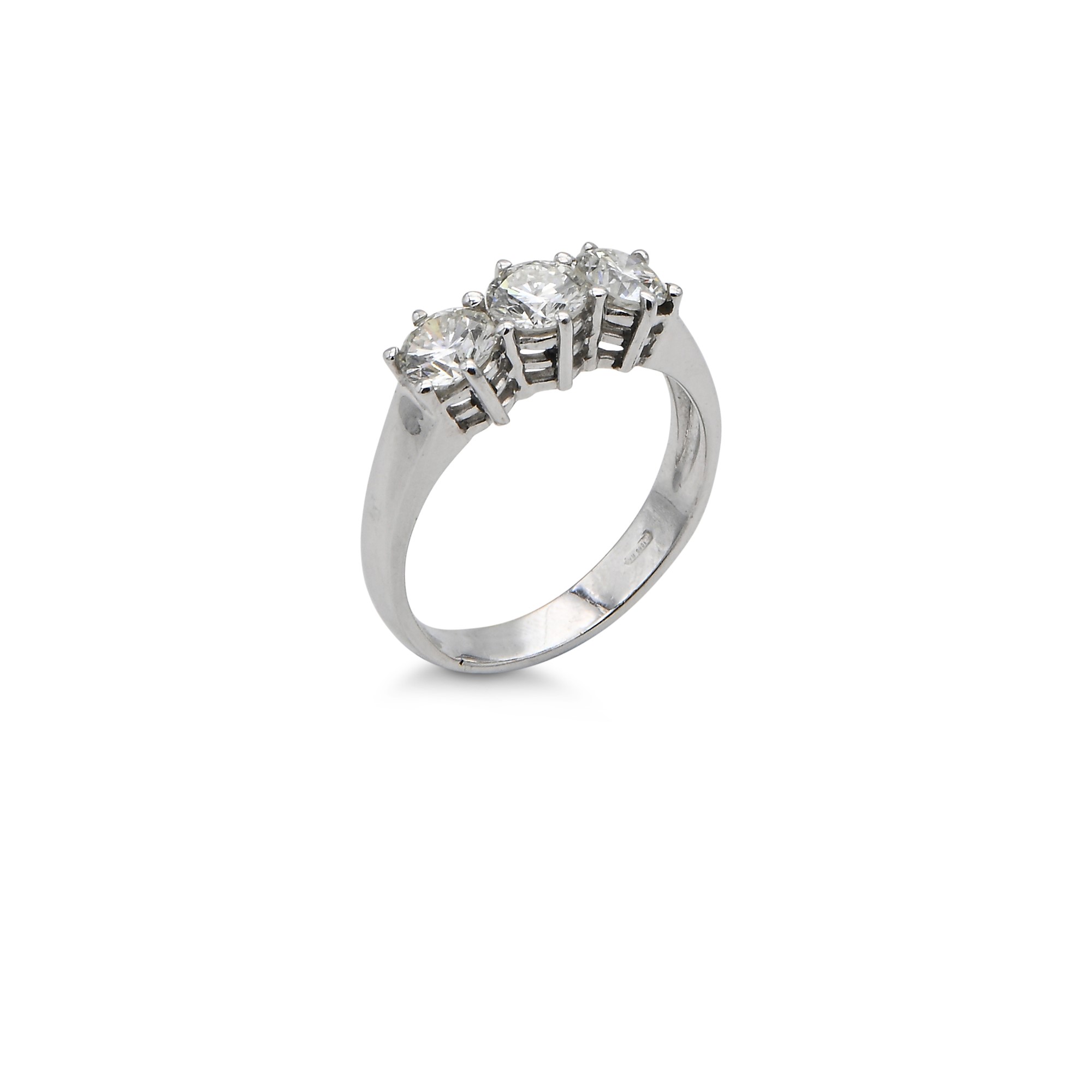 Anello in oro e brillanti Oro bianco 750/000. Diamanti in taglio rotondo brillante ct. 1,53, G, VS. Peso complessivo gr. 4,80. Corredato di certificazione gemmologica. Misura 17