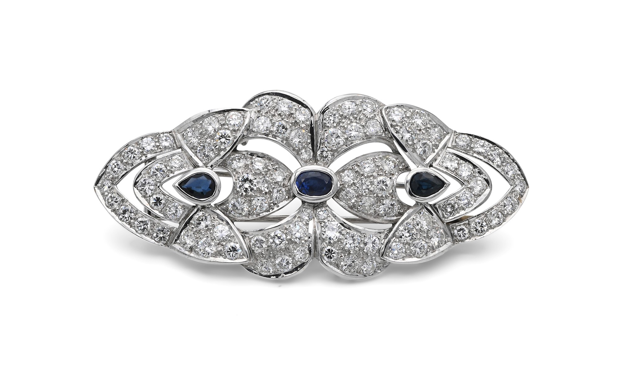 Spilla in oro brillanti e zaffiri Oro bianco 750/000. Diamanti in taglio rotondo ct. 3,80 ca, prob G-H, VVS-VS. Peso complessivo gr. 19,20 cm 7x3