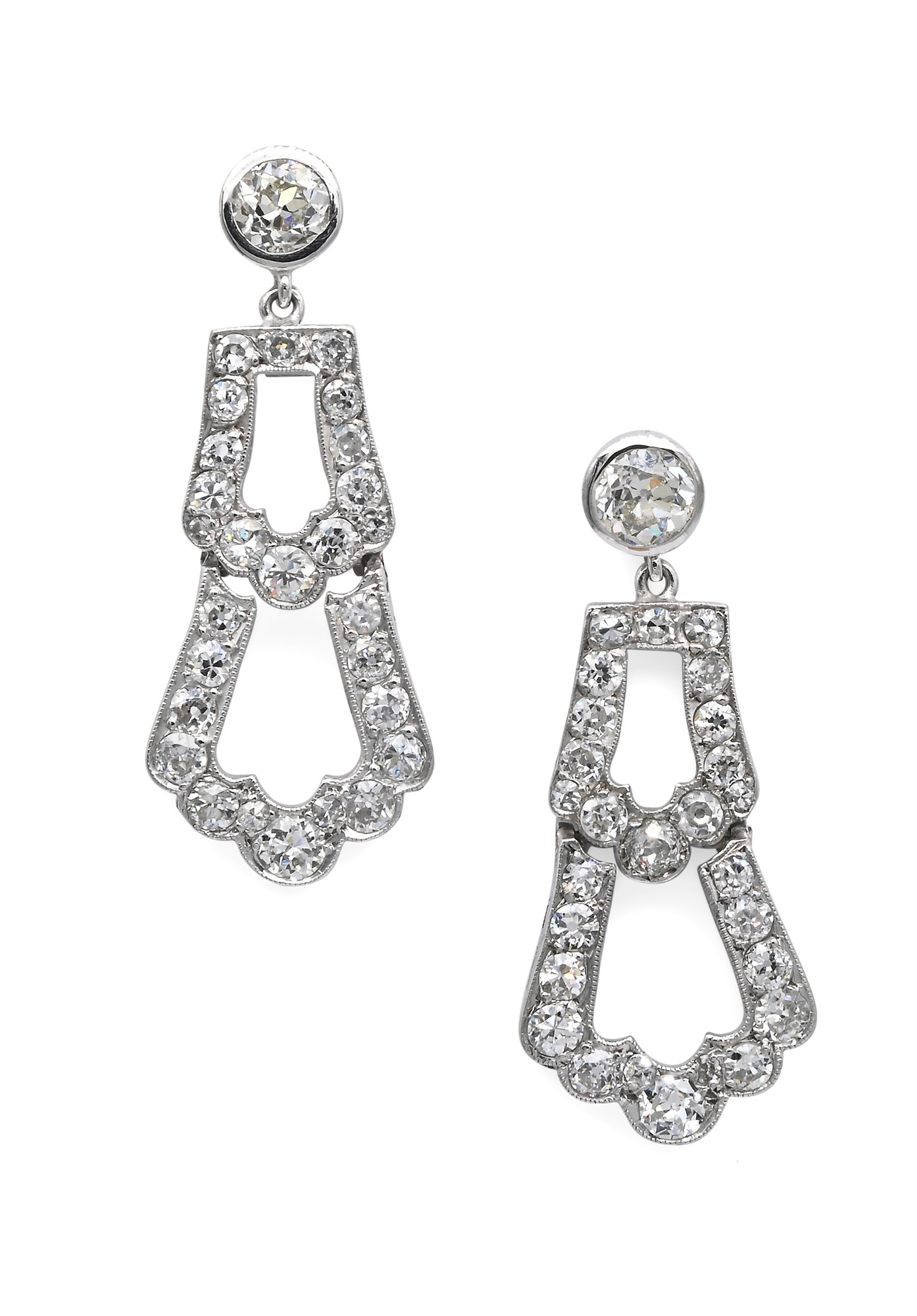 Coppia di orecchini decò in oro e brillanti Oro bianco 750/000. Diamanti in taglio vecchia Europa, ct. 4 ca. Peso complessivo gr. 8,50 Lunghezza cm 4