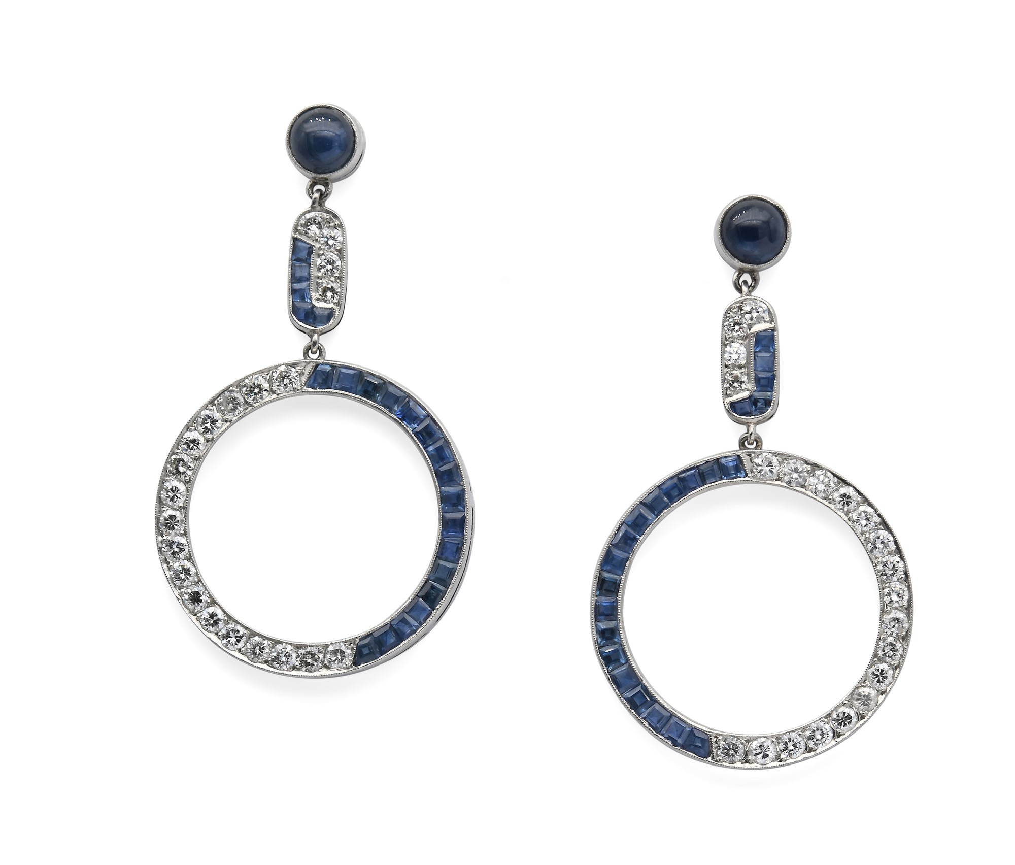 Coppia di orecchini decò pendenti in platino, zaffiri e brillanti. Platino 950/000. Diamanti in taglio rotondo ct. 2,40 ca. Zaffiri in taglio carrè e cabochon. Peso complessivo gr. 13,80 Lunghezza cm 6