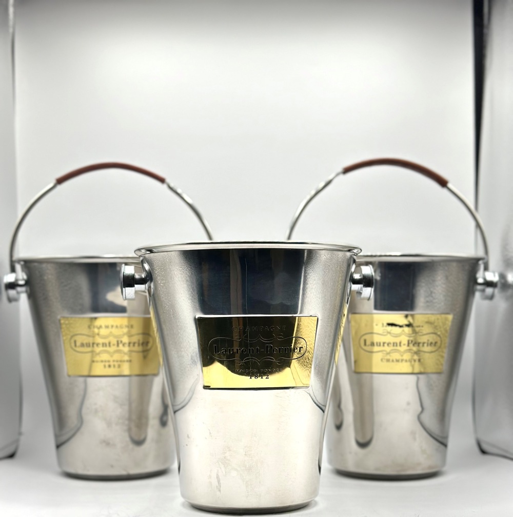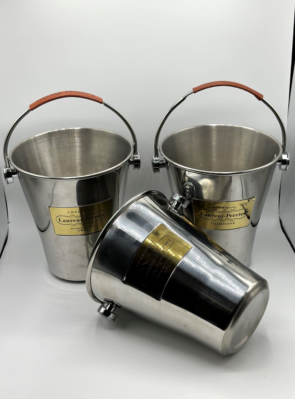 Francia-Champagne Laurent Perrier, 3 secchielli d'acciaio per Champagne con manico in pelle.