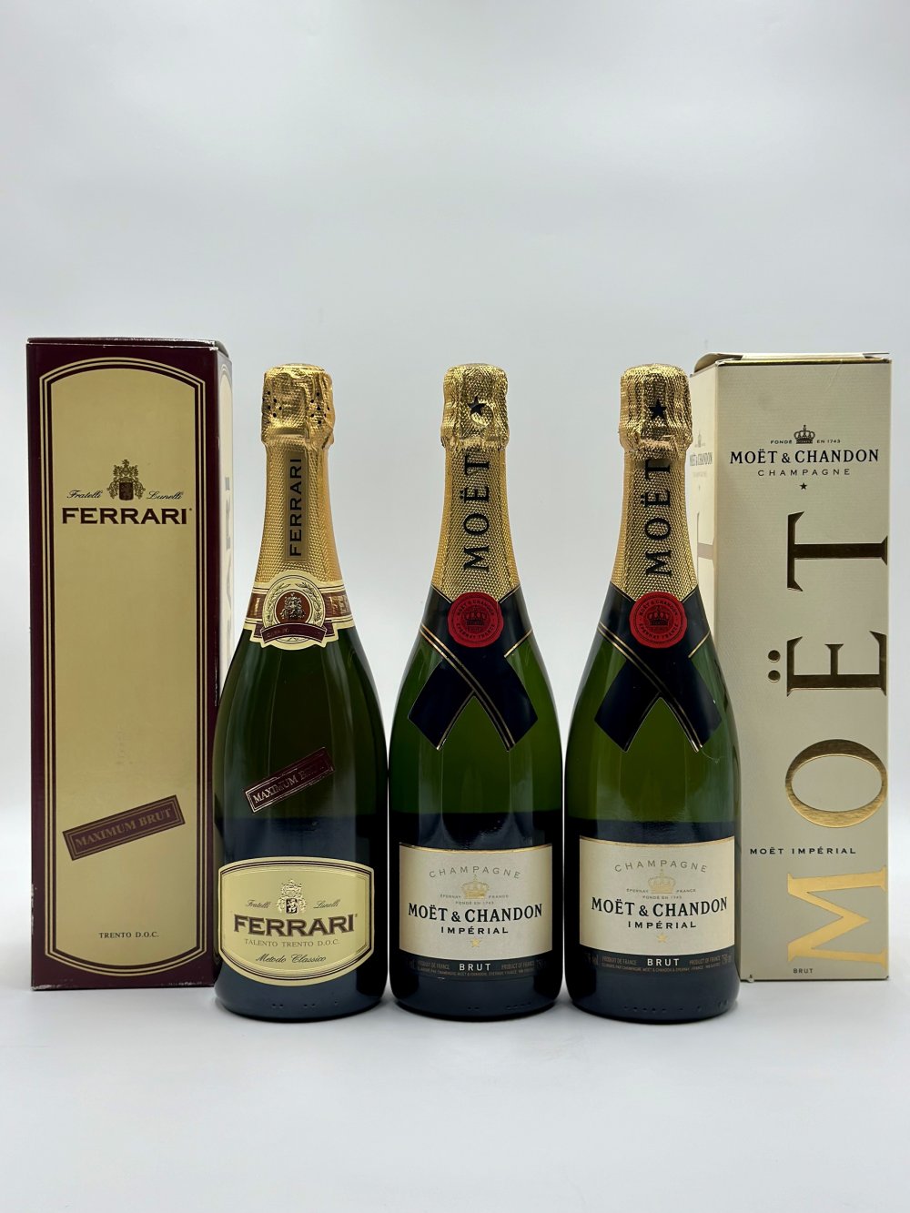 Varie-Varie 0,75 a) Italia, Spumante Brut - 1 bottiglia (bt). Livello: entro il collo (WN). Confezione: scatola originale (OC). Condition report: etichetta e capsula in perfette condizioni. b) Francia, Champagne Brut - 1 bottiglia (bt). Livello: entro il collo (WN). Condition report: etichetta e capsula in perfette condizioni. c) Francia, Champagne Brut - 1 bottiglia (bt). Livello: entro il collo (WN). Confezione: scatola originale (OC). Condition report: etichetta e capsula in perfette condizioni.