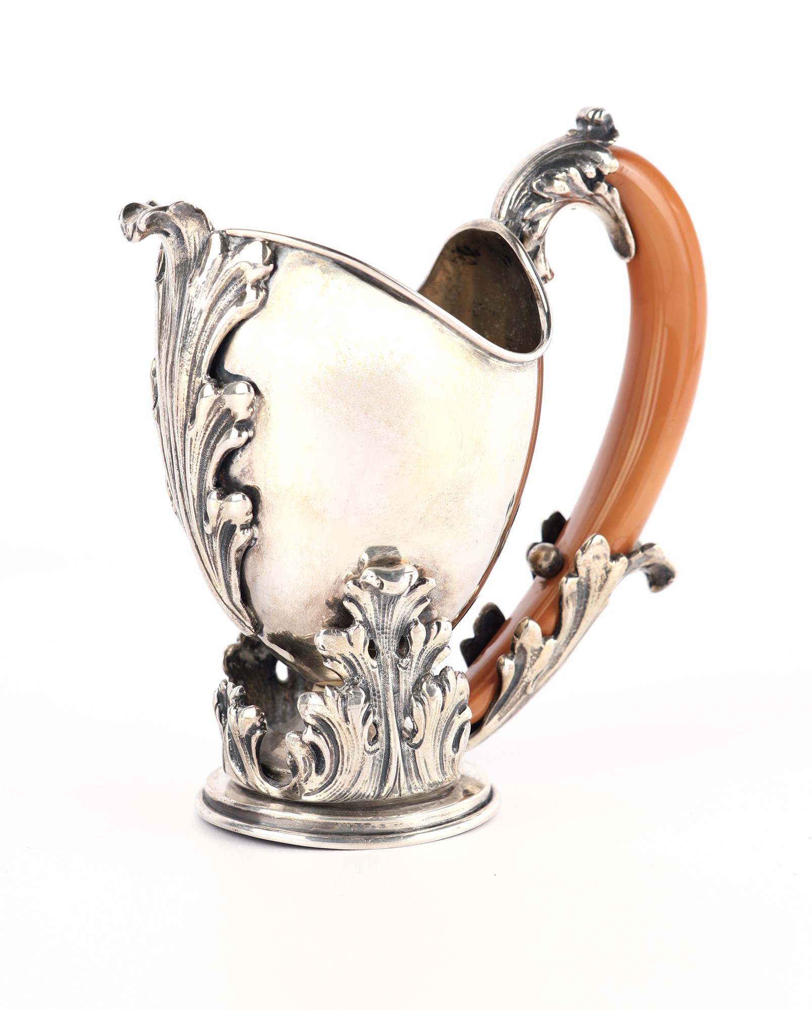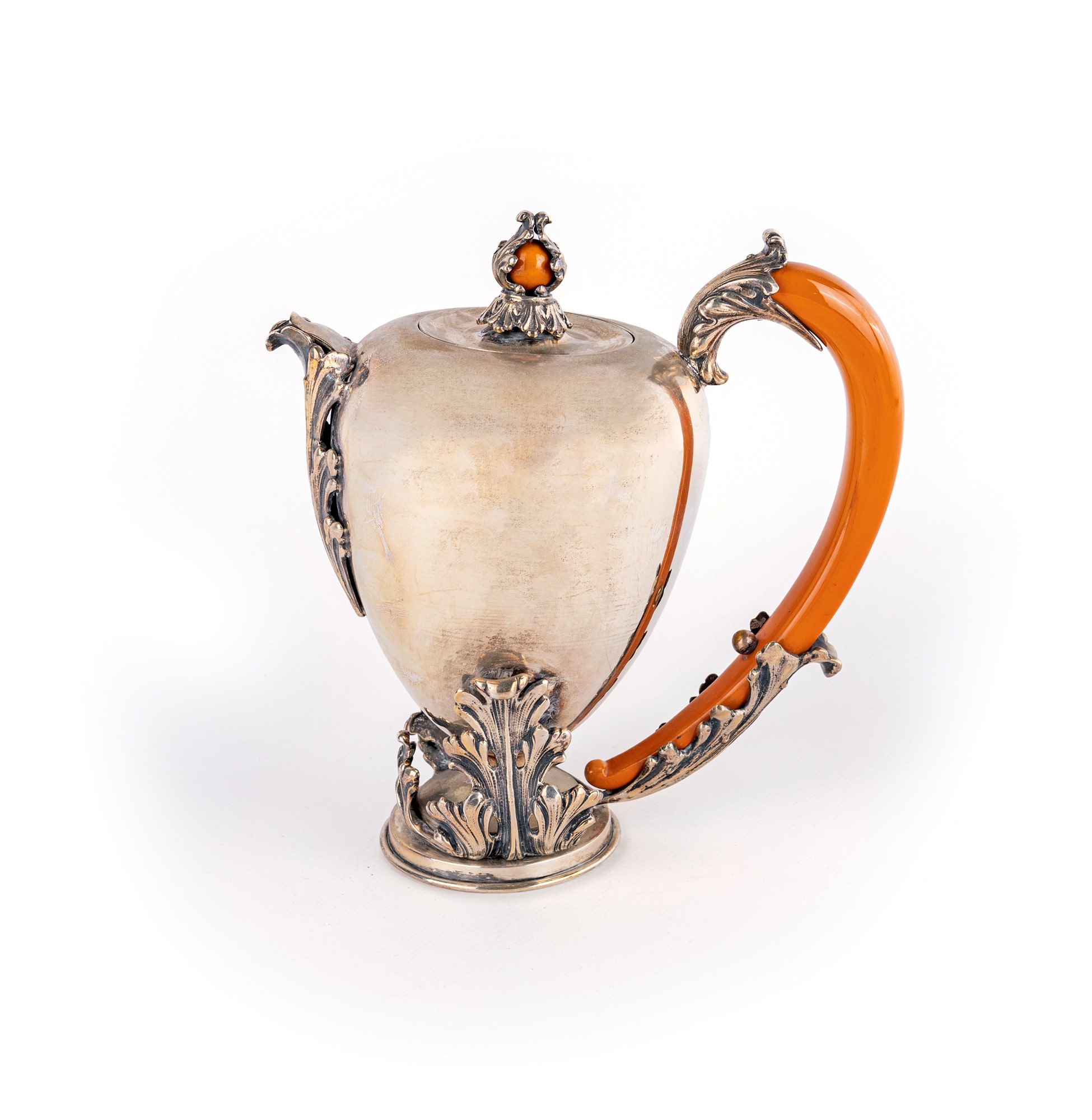 Caffettiera, teiera, lattiera e zuccheriera manici ad imitazione dell'ambra altezza cm 21, cm 20, cm 15 e cm 49x38 rispettivamente - peso complessivo lordo gr. 2235 argento 800/000