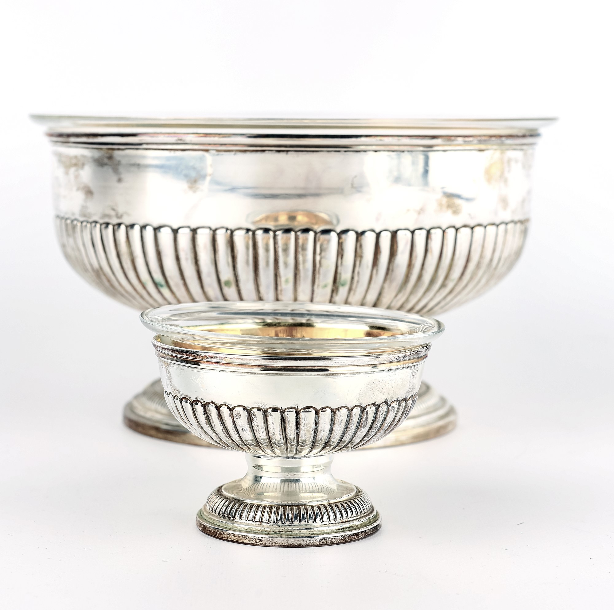Coppa da punch con otto coppette e mestolo in argento 800/000 corpi baccellati su basso piede circolare; interni dorati e vaschette in vetro cm 14x25 e cm 7x11 rispettivamente - mestolo cm 27 - peso complessivo gr. 1910