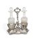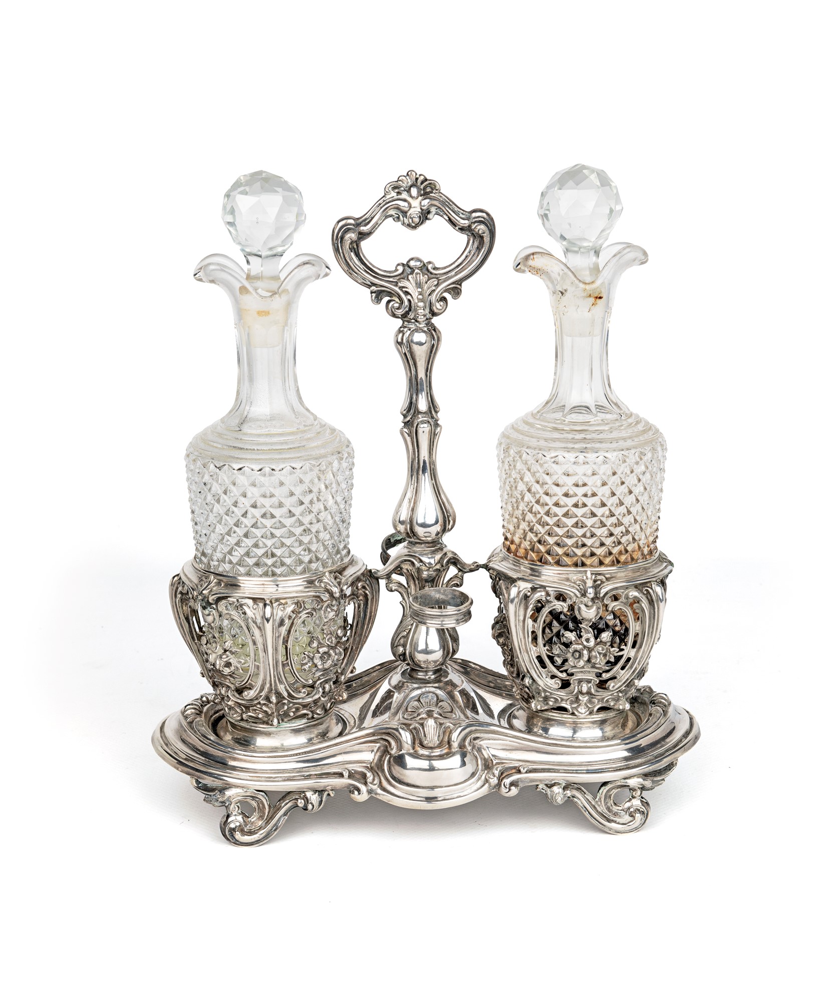 Acetoliera sostegno sagomato sorretto da volute, presa centrale a balaustro con terminale ad anello, contenitori in forma di ceste fiorite con ampolle in vetro con tappo cm 27,5x24x11 - gr. 440 argento sbalzato