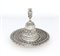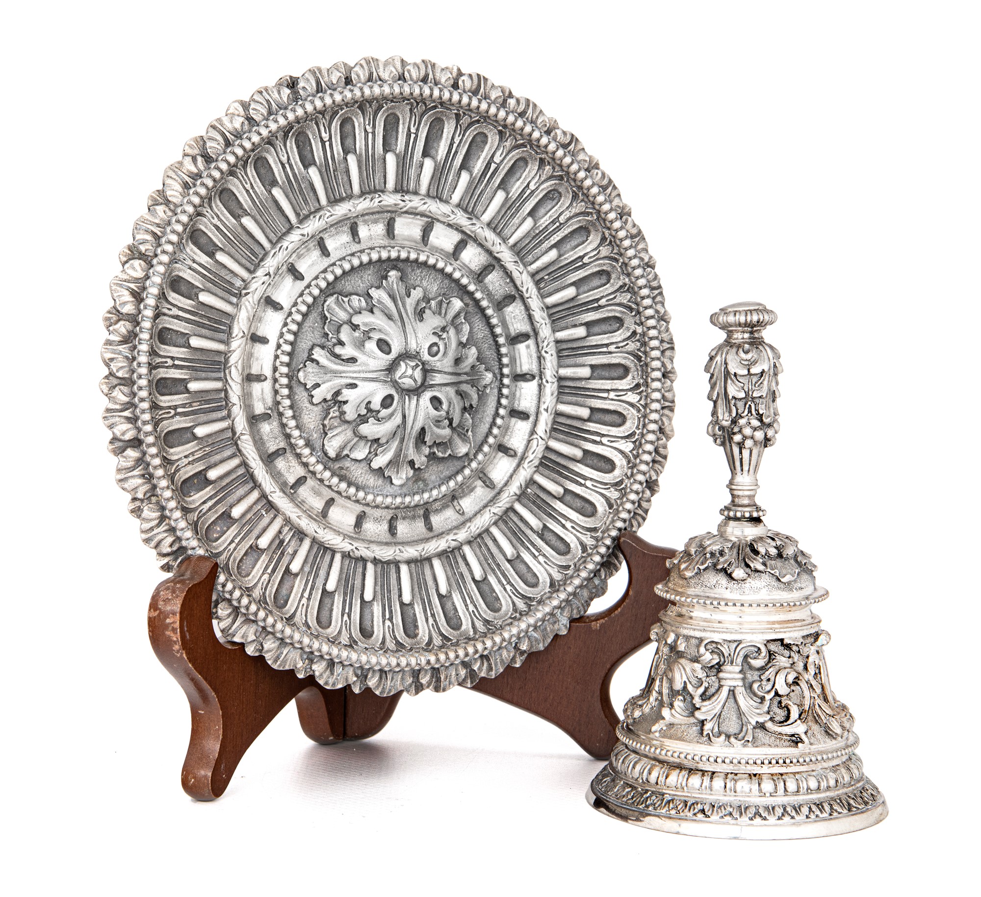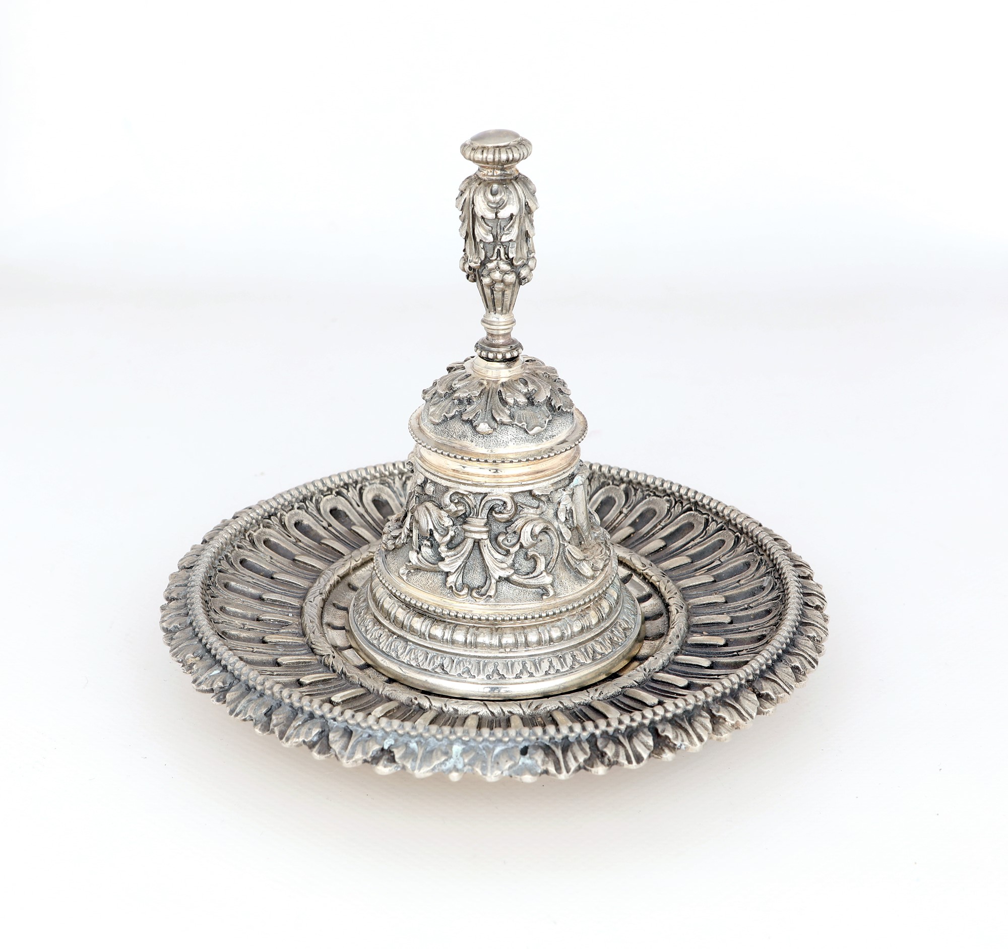 Campanello con piattino in argento 800/000, argentiere Genazzi, Milano 1950 ca. caratterizzati da decorazione in bassorilievo minuziosamente cesellata cm 12x7,5 e diametro cm 16 - peso complessivo gr. 740