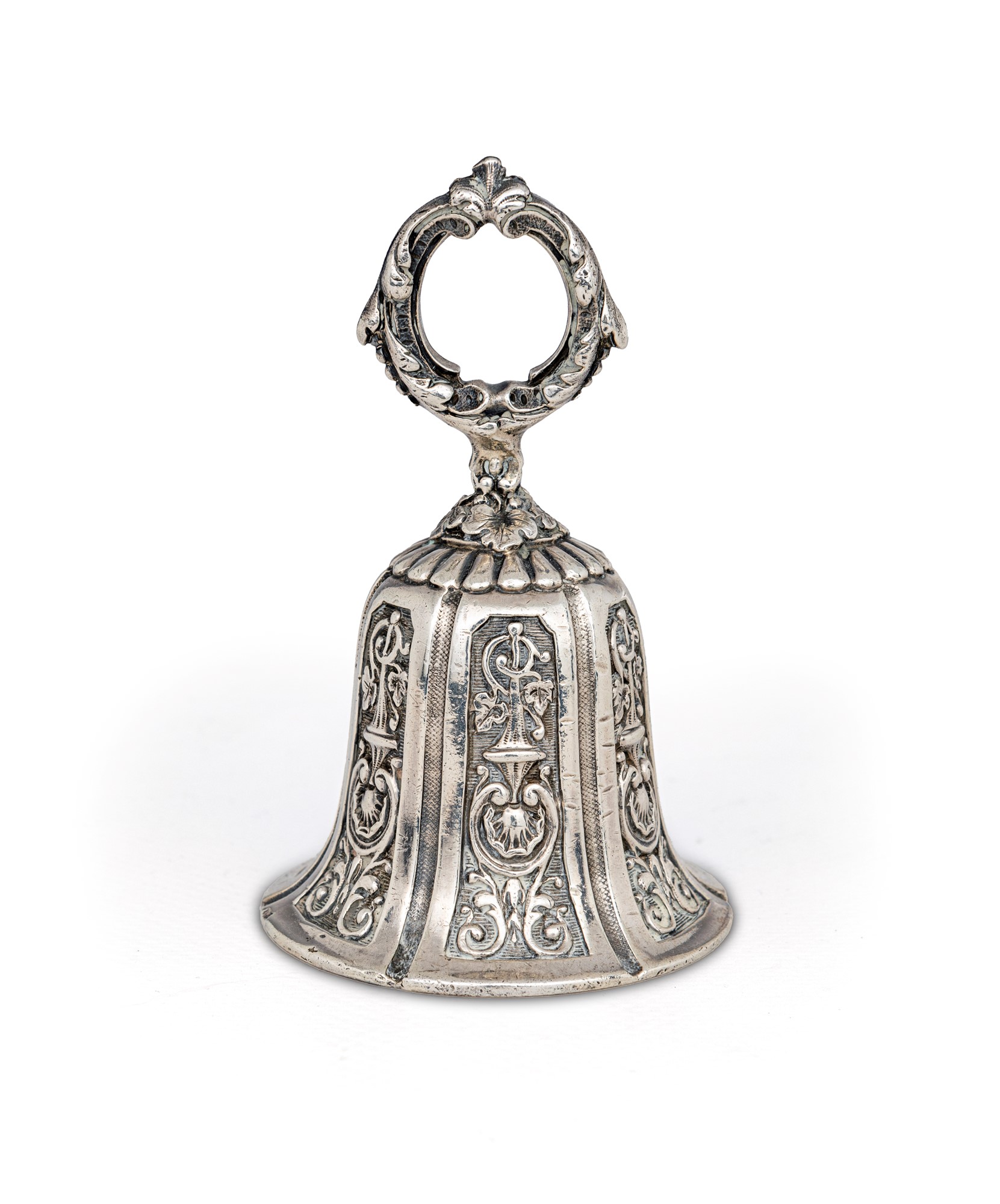 Campanello in argento 800/000 decorato da candelabre cesellate emergenti dal fondo bulinato, entro partizioni lisce; presa ad anello. Bolli consunti cm 10x6 - gr. 190