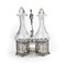 Acetoliera in argento, Stato Pontificio (probabilmente Marche), seconda metà del XVIII secolo due ampolle in vetro con tappo racchiuse in alloggi traforati a motivi ovali intersecantesi fra loro, orli perlinati cm 24x17,5x10 - gr. 440
