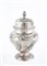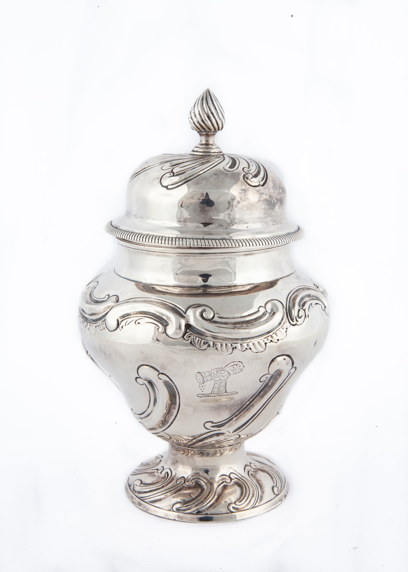 Scatola porta tè Giorgio II, Londra 1758, argentiere Thos Powel corpo a vaso su piede circolare, decorato da volute sbalzate ed incise a creare riserve di cui quella centrale include un cimiero araldico; coperchio a cupolino sormontato da bocciolo cm 16x10 ca. gr. 310 argento 925/000