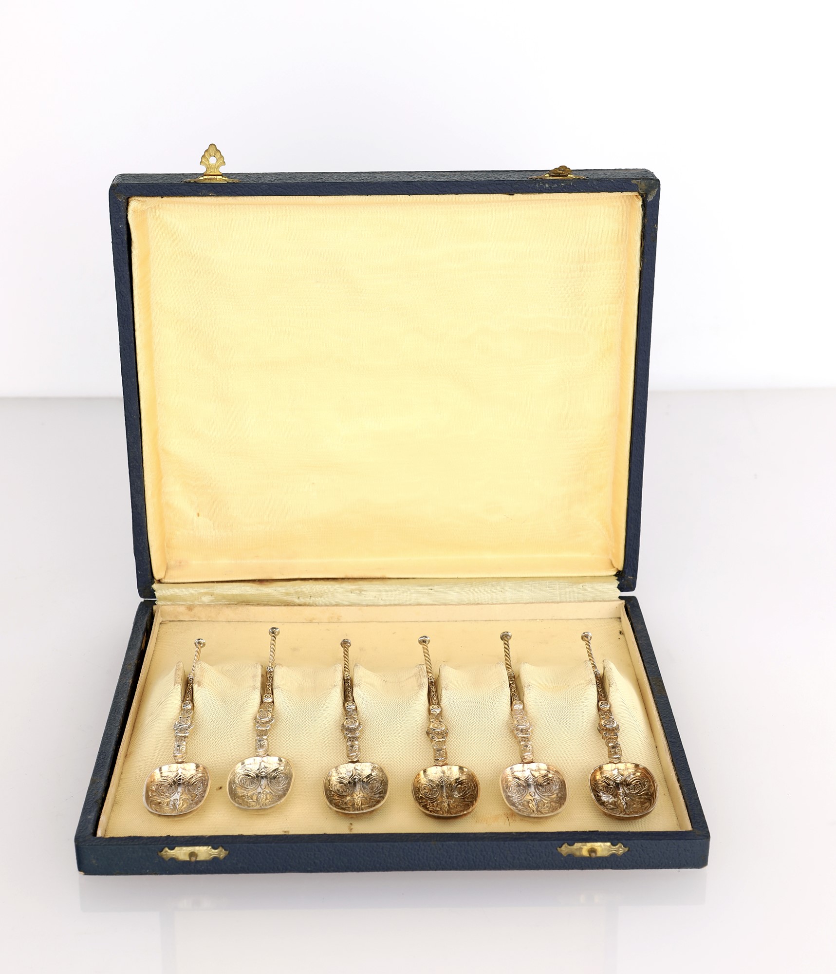 Sei cucchiaini in argento dorato, Londra 1901, argentieri Cornelius Desormeaux e James Francis Shepherd paletta con parte convessa liscia suddivisa da scanalatura a similare uno scarabeo, decorata internamente da volute vegetali contrapposte; esile impugnatura composita incisa a motivi stilizzati; entro astuccio cm 12,5 - peso complessivo gr. 113 - astuccio cm 3,8x23x19,5