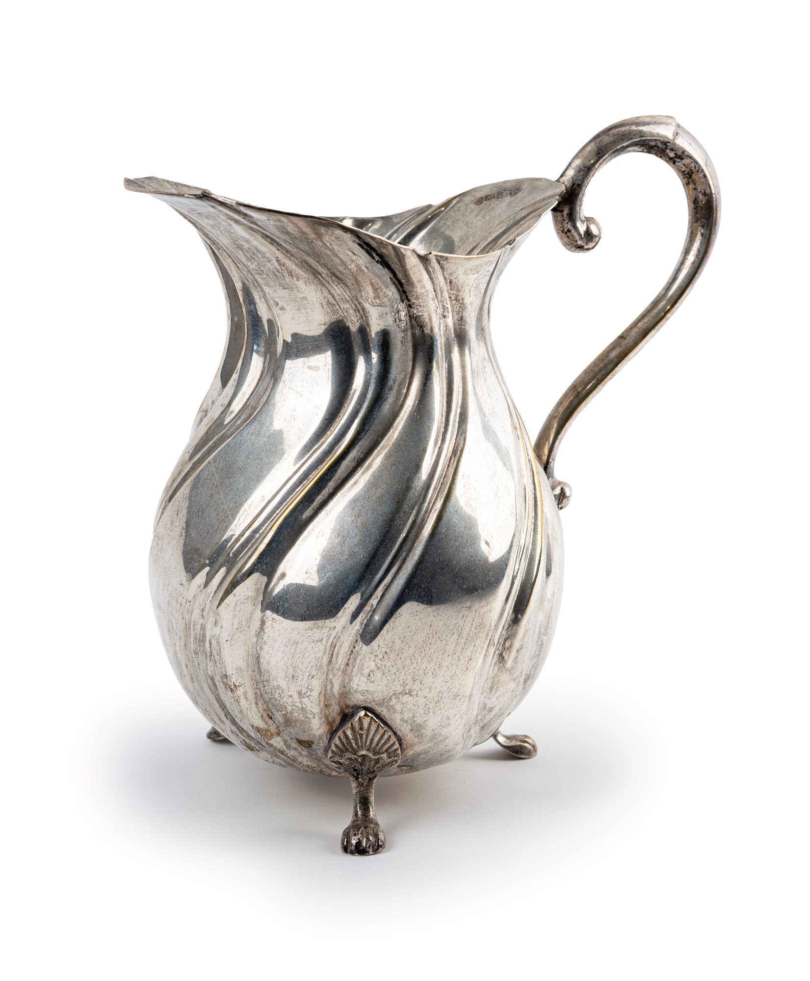 Brocca in argento, città di Sheffield, 1918 caratterizzata da nervature elicoidali; corpo panciuto con orlo svasato, manico sagomato, tre piedi ferini altezza cm 24 - gr. 780