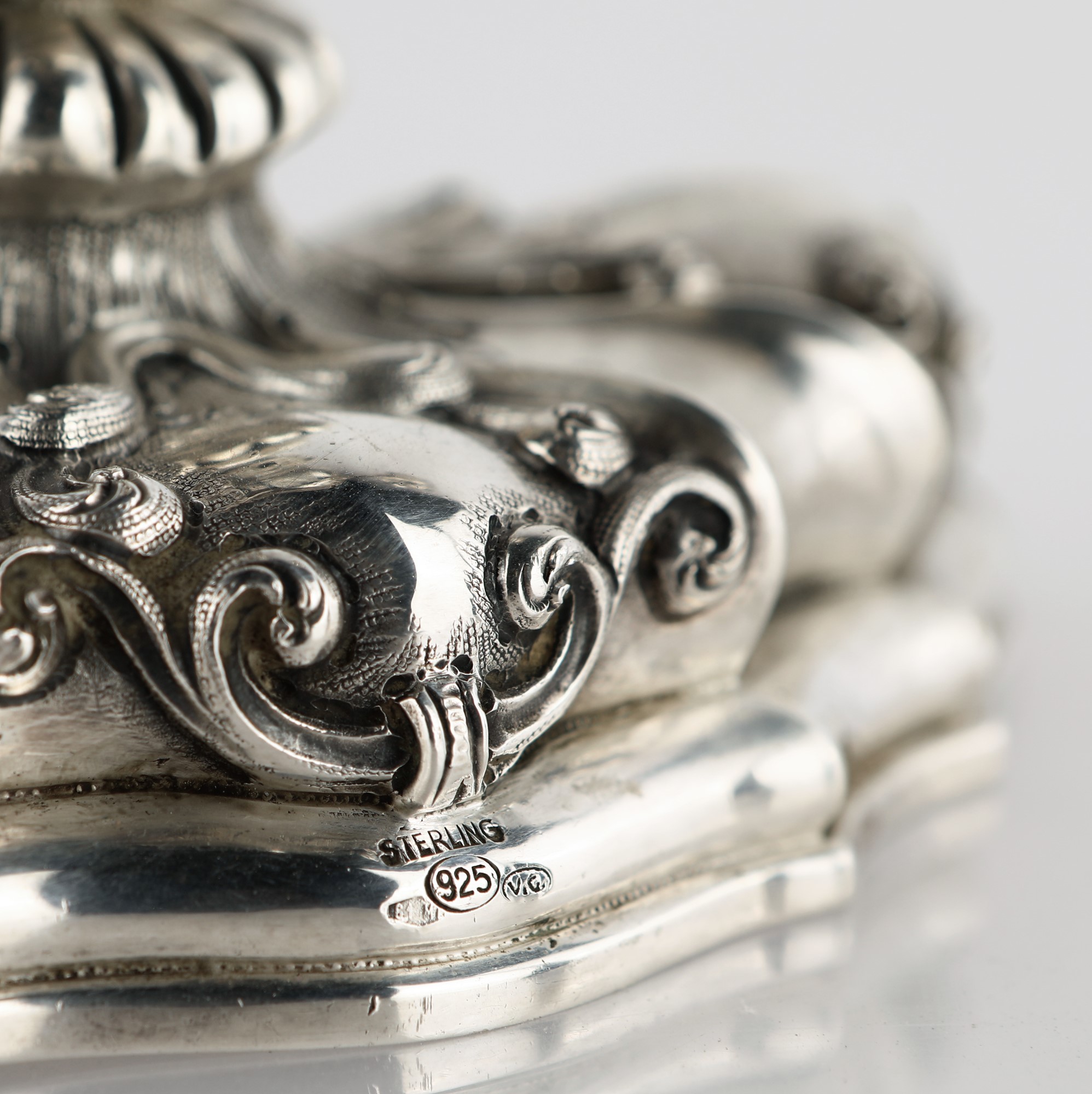 Candelabro in argento sterling a tre luci, Fornari, Roma fusto baccellato e scanalato con volute vegetali incise, dalla cui sommità si erge un cespo fogliaceo da cui si dipartono due braccia arcuate con reggicandela a forma di vaso; base ovale sagomata cm 38,5x37x12 - gr. 1678