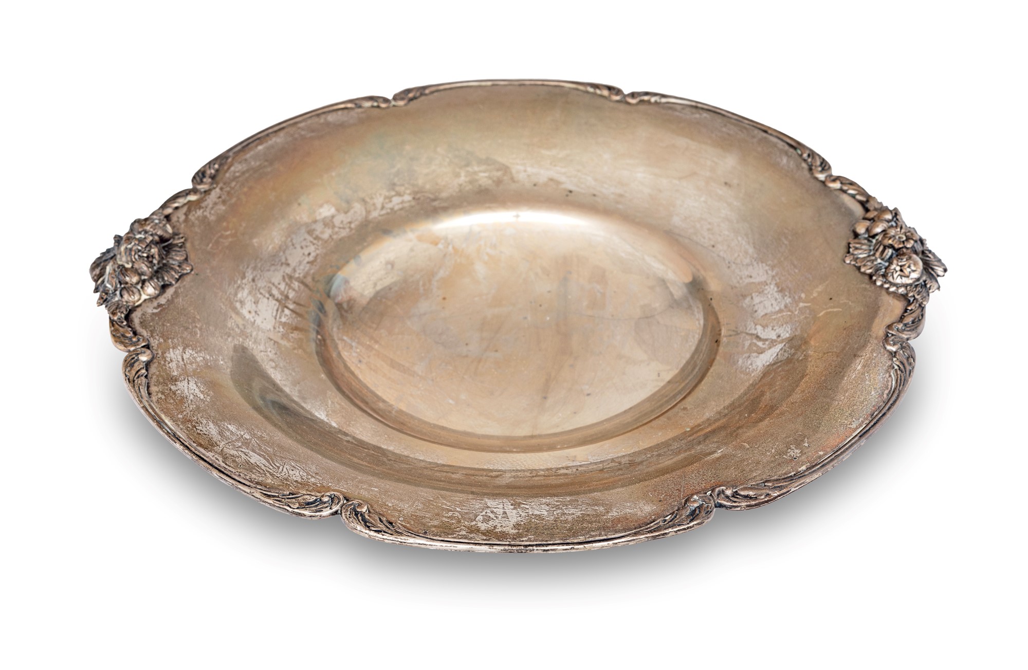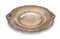 Alzata in argento 800/000 profilo sagomato segnato da volute vegetali e caratterizzato da due composizioni di frutta rese in rilievo come anse; basso piede circolare cm 7x32x30 - gr. 740