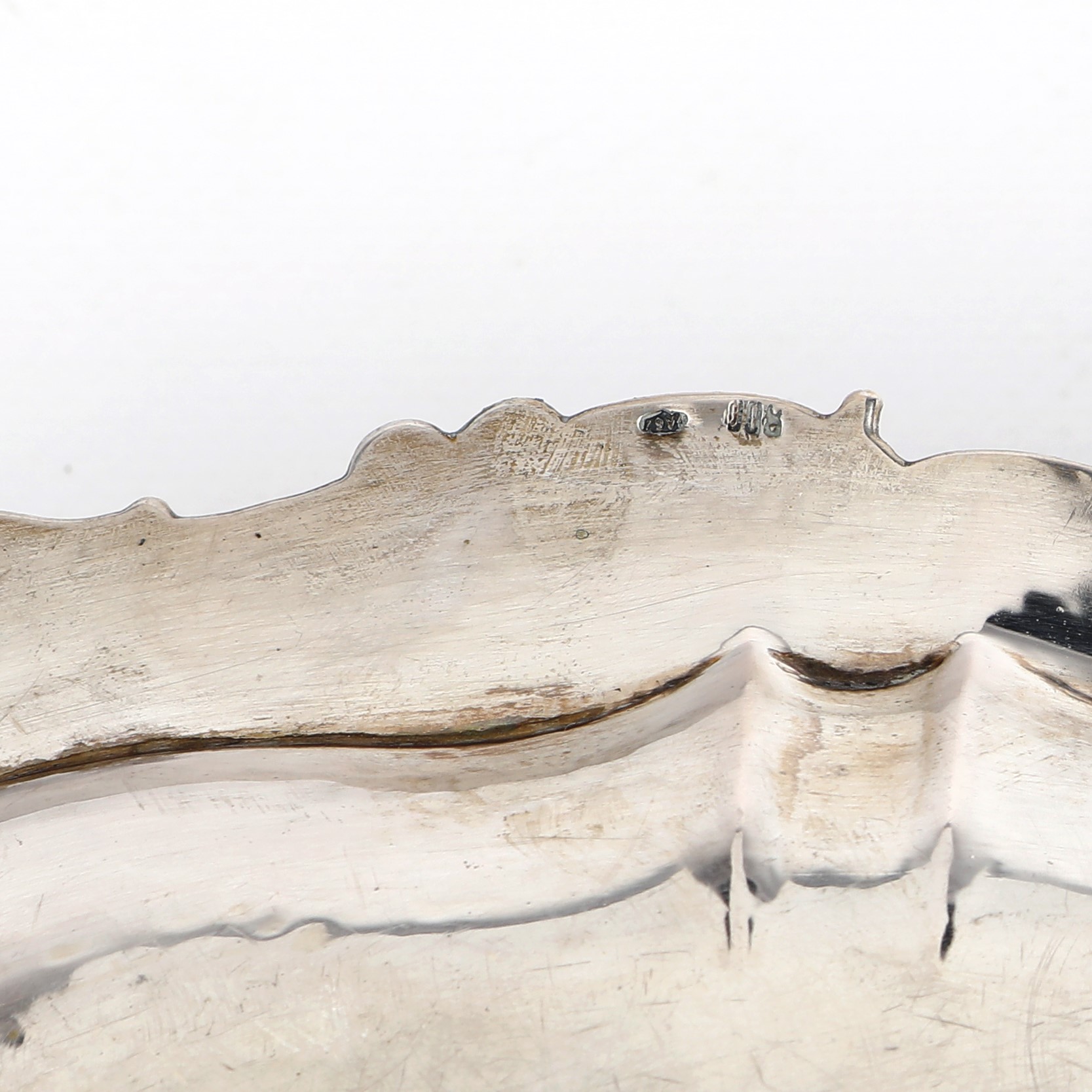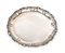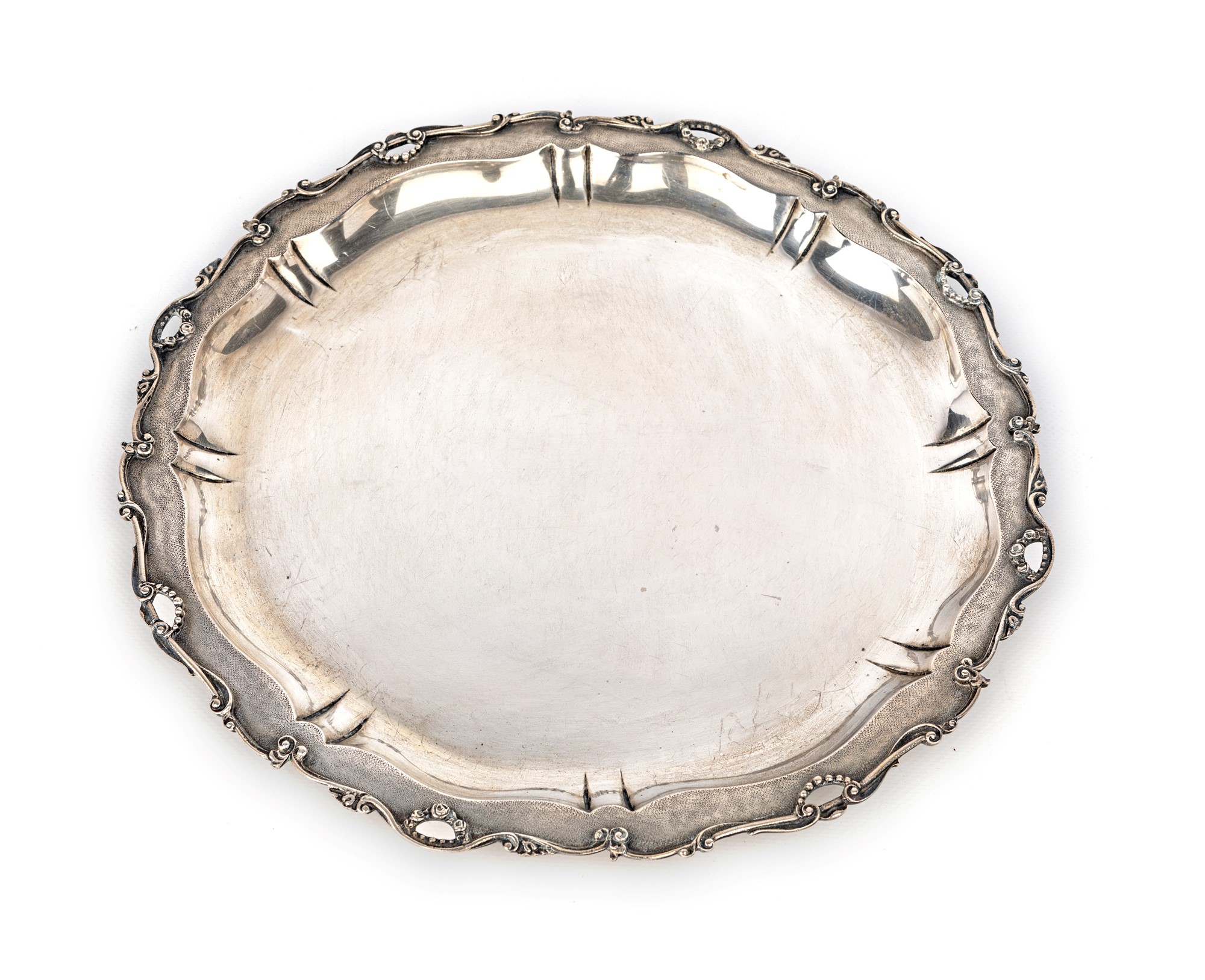 Piatto circolare breve tesa satinata racchiusa da sottili volute contrapposte idealmente intrecciate intorno ad un esile stelo con festone di perline e ghirlanda di rose diametro cm 32 - gr. 688 argento 800/000