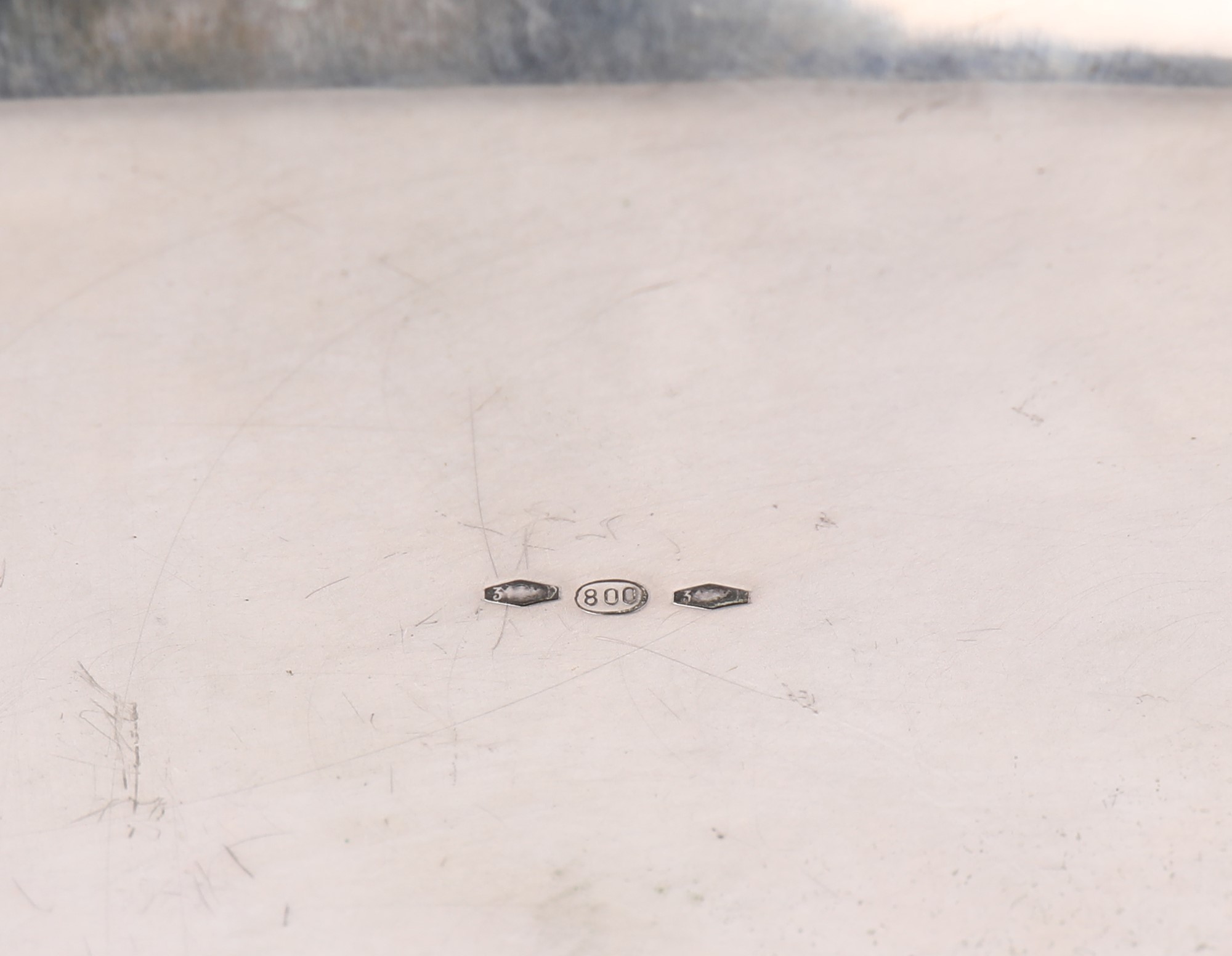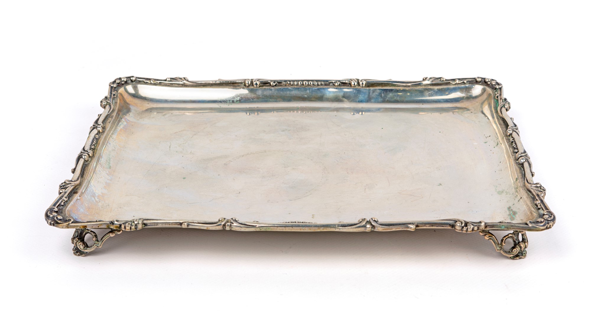 Salver rettangolare orlo percorso da volute vegetali avvolte lungo il profilo; piedi angolari cm 3x30x22,5 - gr. 692 argento 800/000